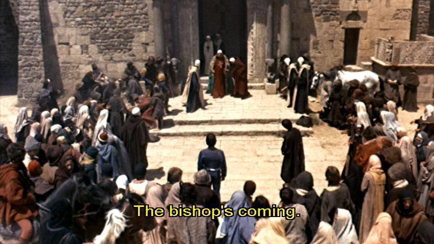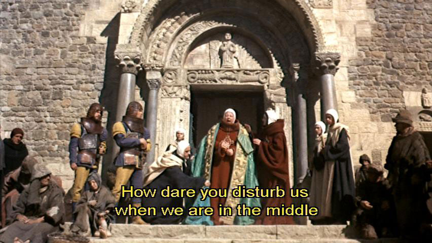 God's teeth! Can a man not be left alone to dine in peace in his own home? [Townspeople] The bishop's coming. [Bishop Guido] Pietro di Bernardone, this will not do. How dare you disturb us when we are in the middle