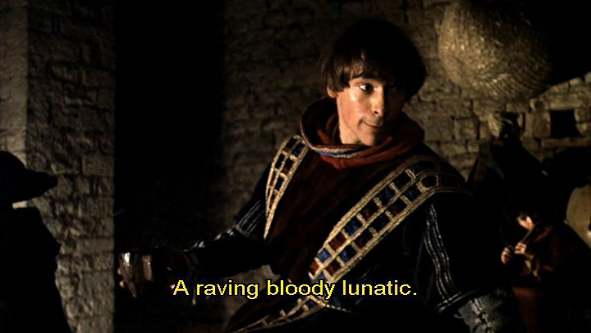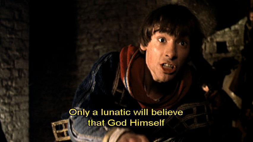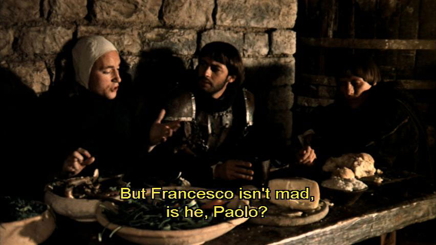 He's pissed, as usual. But Francesco isn't mad, is he, Paolo? No. He's not mad. He's ... He's changed. [Giocondo] He is mad. A raving bloody lunatic. Only a lunatic will believe that God Himself