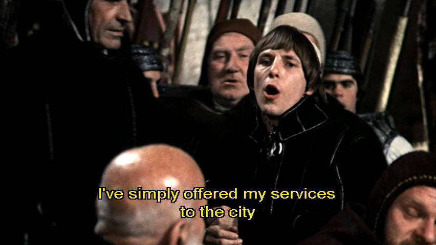 I'm on nobody's side. I've simply offered my services to the city to help stamp out the contagion of San Damiano. [Consul] Your Grace, we are told that the cream of the city's youth has already been curdled