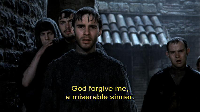 God forgive me, a miserable sinner. [Francesco] He probably heard you the first time. [Giocondo] Go away. Leave me alone. [Francesco] Tell me. [Giocondo] I can take all the rest, the cold, the hunger, but there are days and nights when