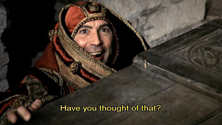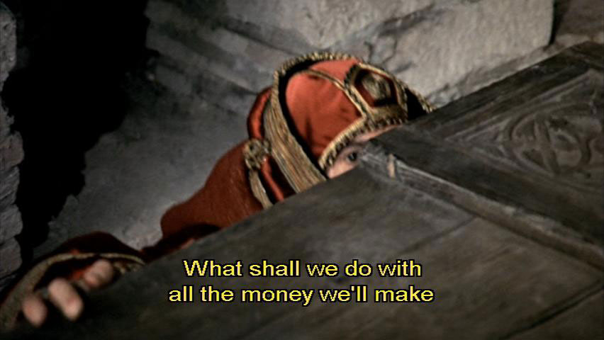 [Francesco] Hey, wait, we must talk. What shall we do with all the money we'll make out of this war? Have you thought of that? [Pietro di Bernardone] Ah ... I see.