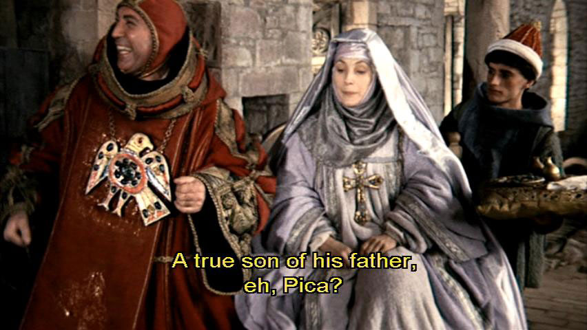 A true son of his father, eh, Pica? [Pica] We are going to be late for mass, Monsignor. [Pietro di Bernardone] Ah, they'll wait. Listen, Francesco ... out of the way, out of the way. Francesco, w-when you're in Perugia, don't forget Ugoni's storerooms behind the marketplace, near the main tower.