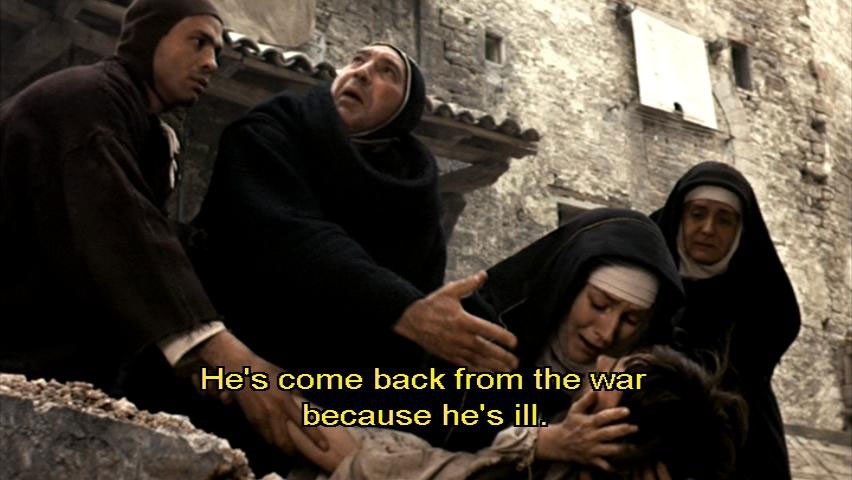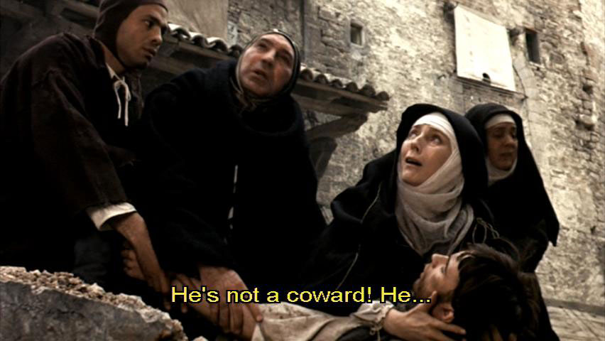 [Pietro di Bernardone] He's come back from the war because he's ill. He's not a coward! He ... [Pica] My dear son. [Pietro di Bernardone] Come on! Come, come. [Donovan singing] Warm are the loaves that cool on the sill