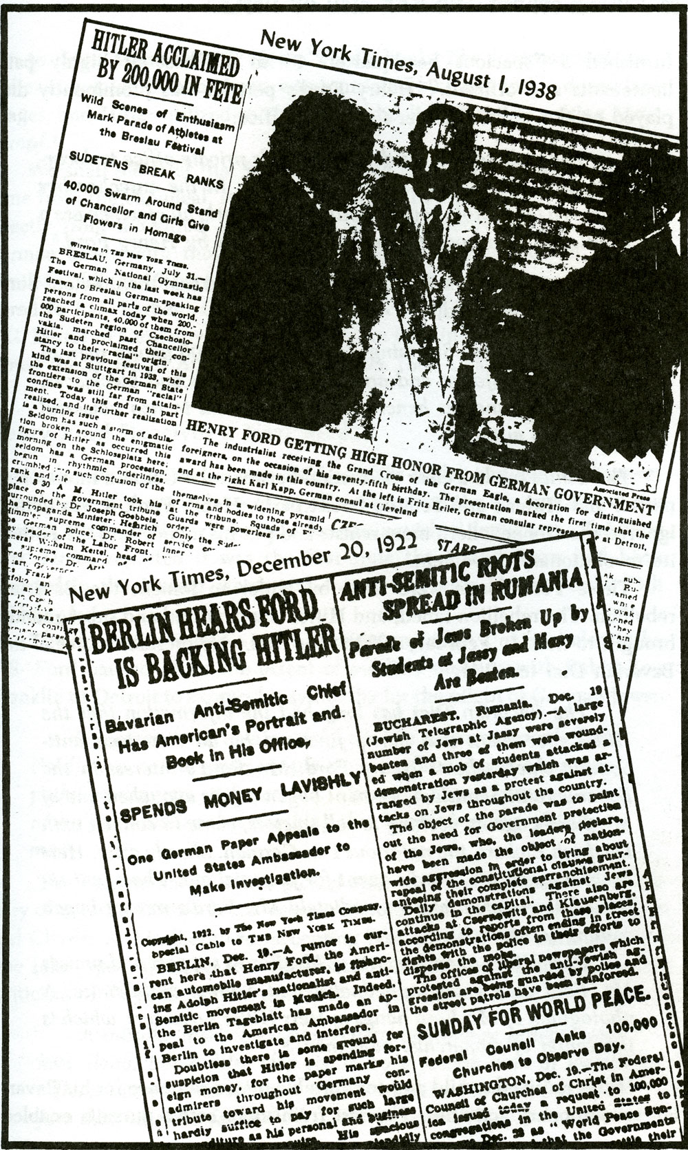 New York Times, August 1, 1938: HITLER ACCLAIMED BY 200,000 IN FETE; New York Times, December 20, 1922: BERLIN HEARS FORD IS BACKING HITLER The same New York Times report commented that the previous Sunday Hitler had reviewed,