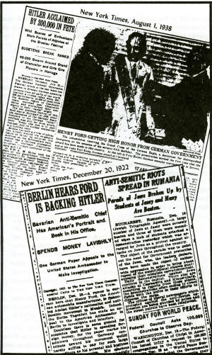 On the other hand, when we probe behind these public statements we find that Henry Ford and son Edsel Ford have been in the forefront of American businessmen who try to walk both sides of every ideological fence in search of profit. Using Ford's own criteria, the Fords are among the "destructive" elements. It was Henry Ford who in the 1930s built the Soviet Union's first modern automobile plant (located at Gorki) and which in the 50s and 60s produced the trucks used by the North Vietnamese to carry weapons and munitions for use against Americans.2 At about the same time, Henry Ford was also the most famous of Hitler's foreign backers, and he was rewarded in the 1930s for this long-lasting support with the highest Nazi decoration for foreigners. This Nazi favor aroused a storm of controversy in the United States and ultimately degenerated into an exchange of diplomatic notes between the German Government and the State Department. While Ford publicly protested that he did not like totalitarian governments, we find in practice that Ford knowingly profited from both sides of World War II — from French and German plants producing vehicles at a profit for the Wehrmacht, and from U.S. plants building vehicles at a profit for the U.S. Army. Henry Ford's protestations of innocence suggest, as we shall see in this chapter, that he did not approve of Jewish financiers profiting from war (as some have), but if anti-Semitic Morgan3 and Ford profited from war that was acceptable, moral and "constructive." Henry Ford: Hitler's First Foreign Backer On December 20, 1922 the New York Times reported4 that automobile manufacturer Henry Ford was financing Adolph Hitler's nationalist and anti-Semitic movements in Munich. Simultaneously, the Berlin newspaper Berliner Tageblatt appealed to the American Ambassador in Berlin to investigate and halt Henry Ford's intervention into German domestic affairs. It was reported that Hitler's foreign backers had furnished a "spacious headquarters" with a "host of highly paid lieutenants and officials." Henry Ford's portrait was prominently displayed on the walls of Hitler's personal office: