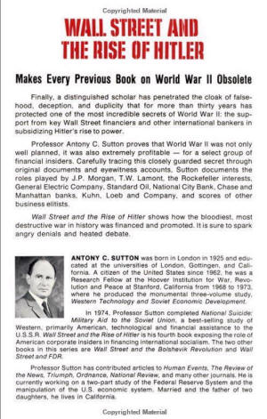 Each of these events introduced some variant of socialism into a major country — i.e., Bolshevik socialism in Russia, New Deal socialism in the United States, and National socialism in Germany. Contemporary academic histories, with perhaps the sole exception of Carroll Quigley's Tragedy And Hope, ignore this evidence. On the other hand, it is understandable that universities and research organizations, dependent on financial aid from foundations that are controlled by this same New York financial elite, would hardly want to support and to publish research on these aspects of international politics. The bravest of trustees is unlikely to bite the hand that feeds his organization. It is also eminently clear from the evidence in this trilogy that "public-spirited businessmen" do not journey to Washington as lobbyists and administrators in order to serve the United States. They are in Washington to serve their own profit-maximizing interests. Their purpose is not to further a competitive, free-market economy, but to manipulate a politicized regime, call it what you will, to their own advantage. It is business manipulation of Hitler's accession to power in March 1933 that is the topic of Wall Street and the Rise of Hitler. ANTONY C. SUTTON July, 1976