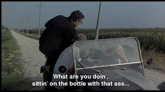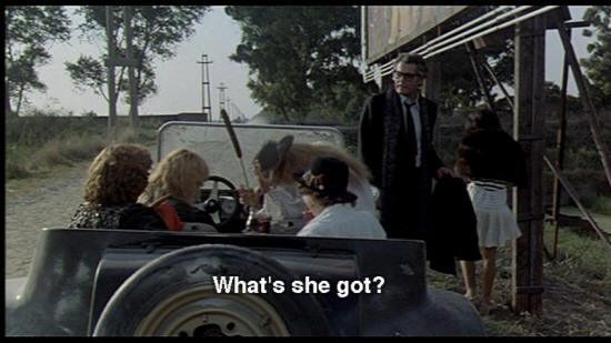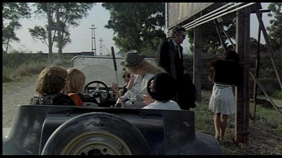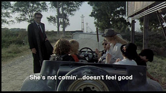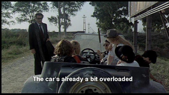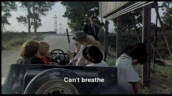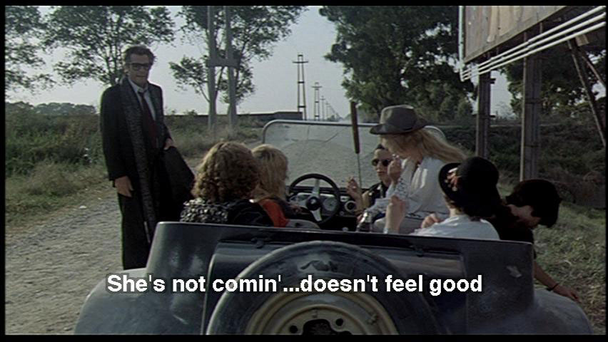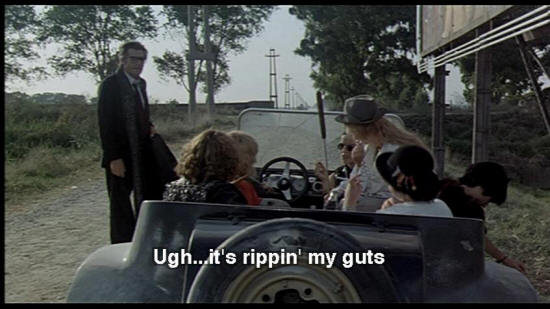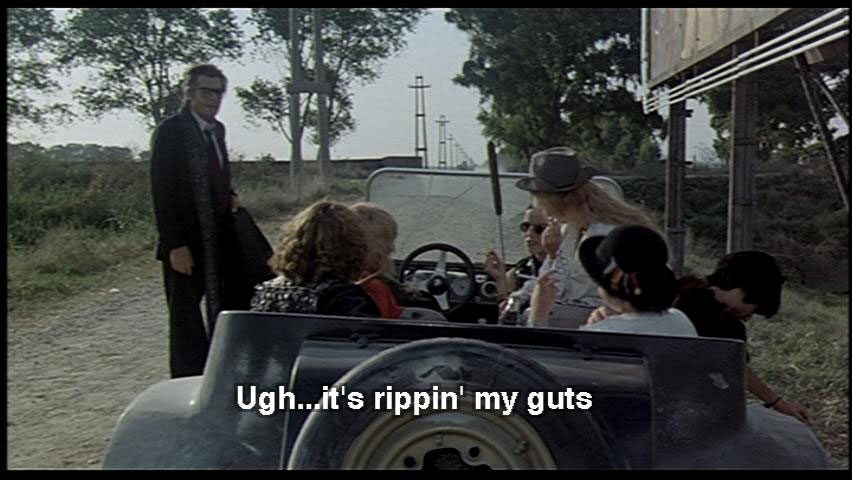 SNAPORAZ: The car's already a bit overloaded. GIRL: She's not comin' ... doesn't feel good. GIRL: Ugh ... it's rippin' my guts. Can't breathe. SNAPORAZ: What's she got? GIRLS: (Laughter) SNAPORAZ: Where'll I sit? GIRL: What are you doin', sittin' on the bottle with that ass ...