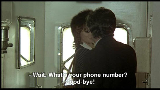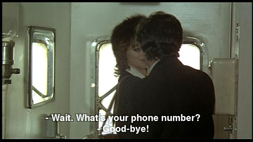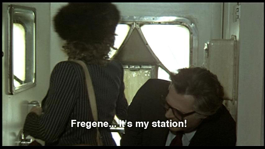 WOMAN ON TRAIN: Where are we? Fregene ... It's my station! SNAPORAZ: Wait. What's your phone number? WOMAN ON TRAIN: Good-bye! SNAPORAZ: She's not getting away.