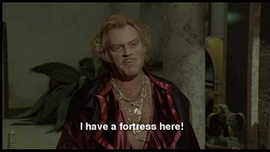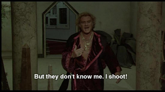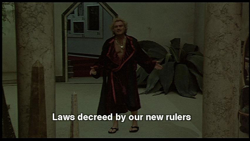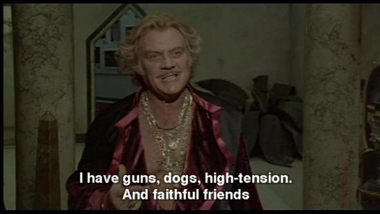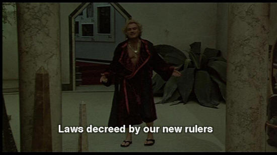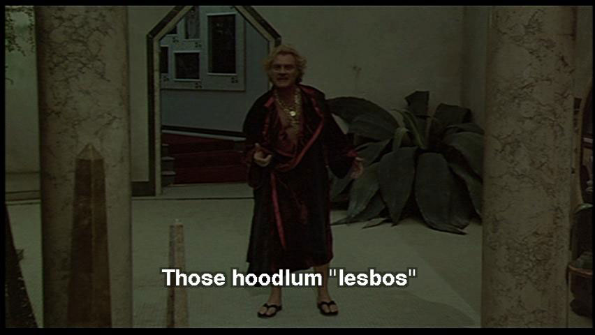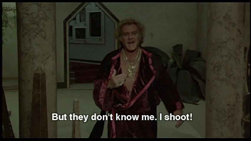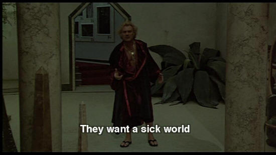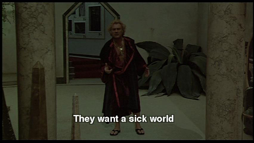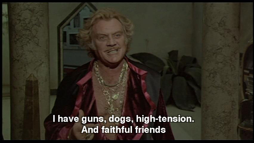 DR. ZUBERKOCK: Laws decreed by our new rulers. Those hoodlum "lesbos". They want a sick world. But they don't know me. I shoot! I have guns, dogs, high-tension. And faithful friends. SNAPORAZ: Yes, but I must ... DR. ZUBERKOCK: I have a fortress here!