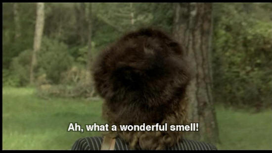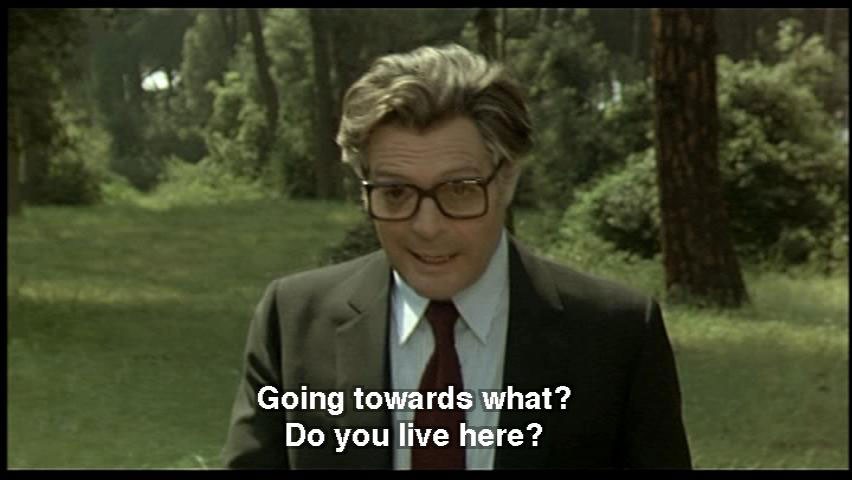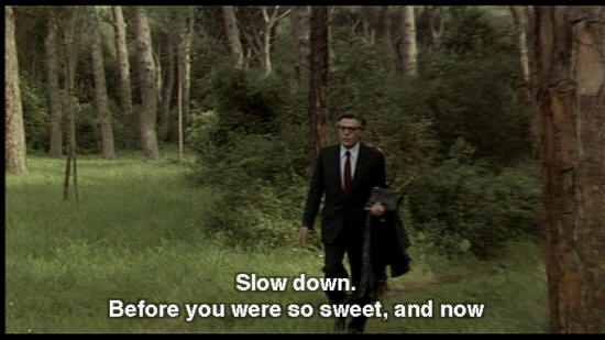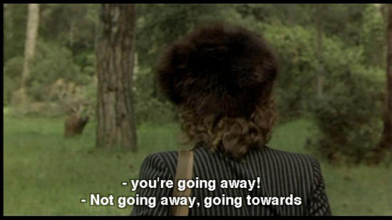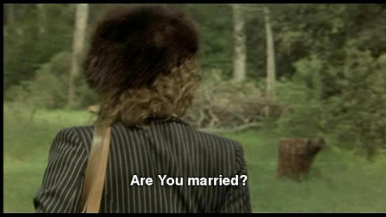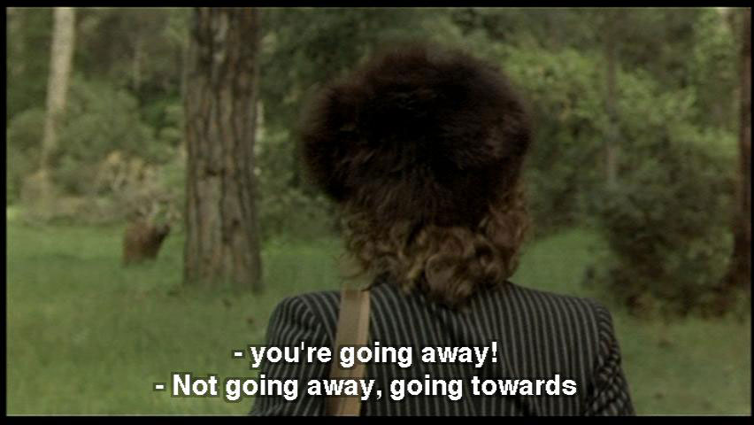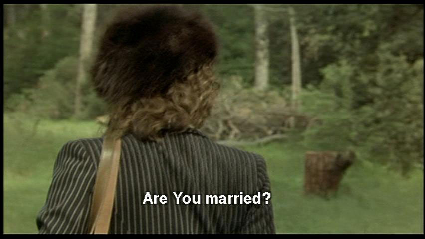 Slow down. Before you were so sweet, and now ... you're going away! WOMAN ON TRAIN: Not going away, going towards. SNAPORAZ: Going towards what? Do you live here? WOMAN ON TRAIN: Ah, what a wonderful smell! These trees use finer perfumes than your playmates. Are you married? SNAPORAZ: No. That is, yes. Only once. But I have no ...