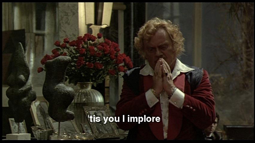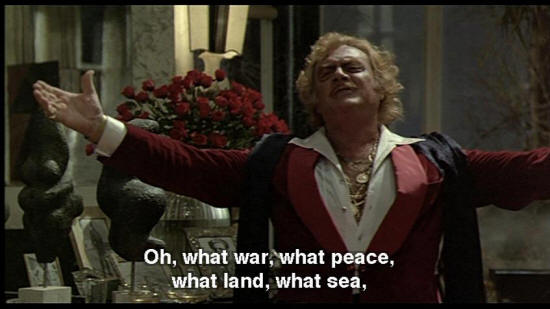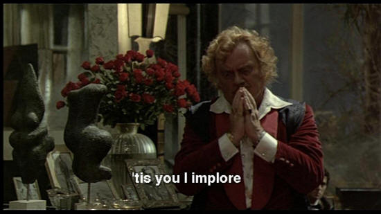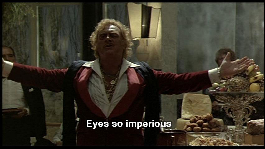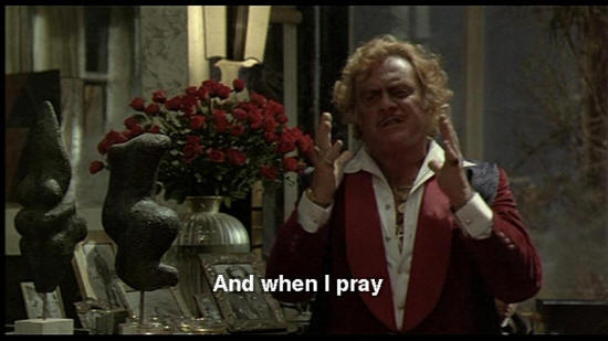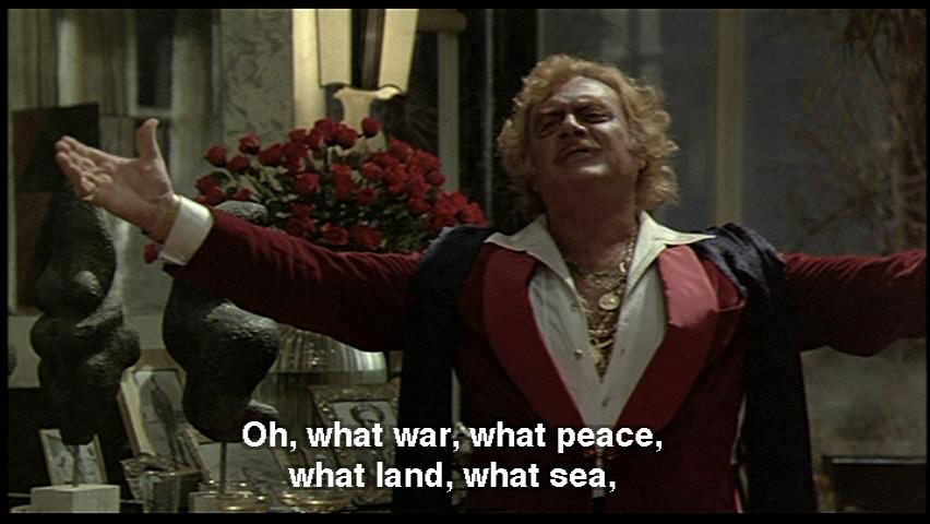 DR. ZUBERKOCK: Adieu woman! Oh, what war, what peace, what land, what sea ... you were for me. Water and fire, all is desire ... And when I pray ... 'tis you I implore. Adieu ... Eyes so imperious.