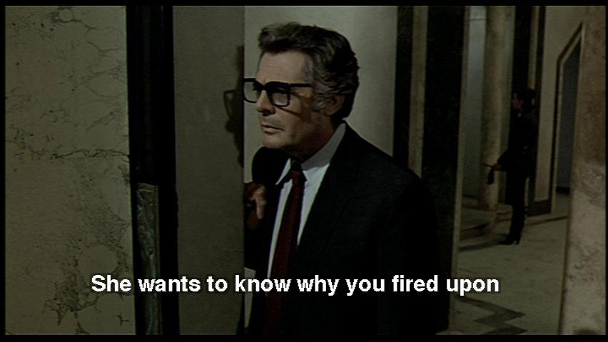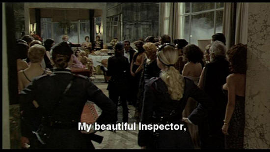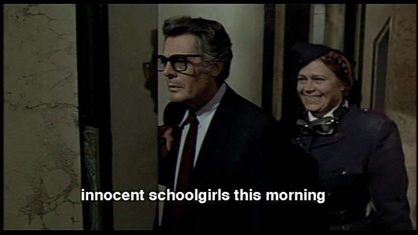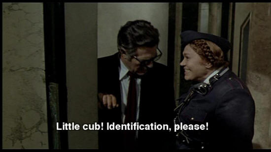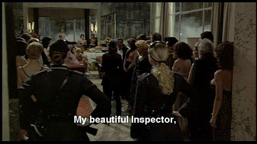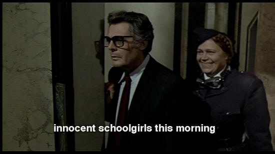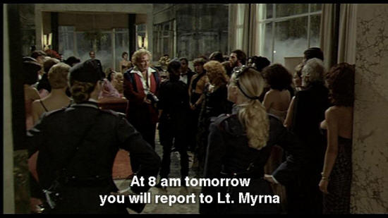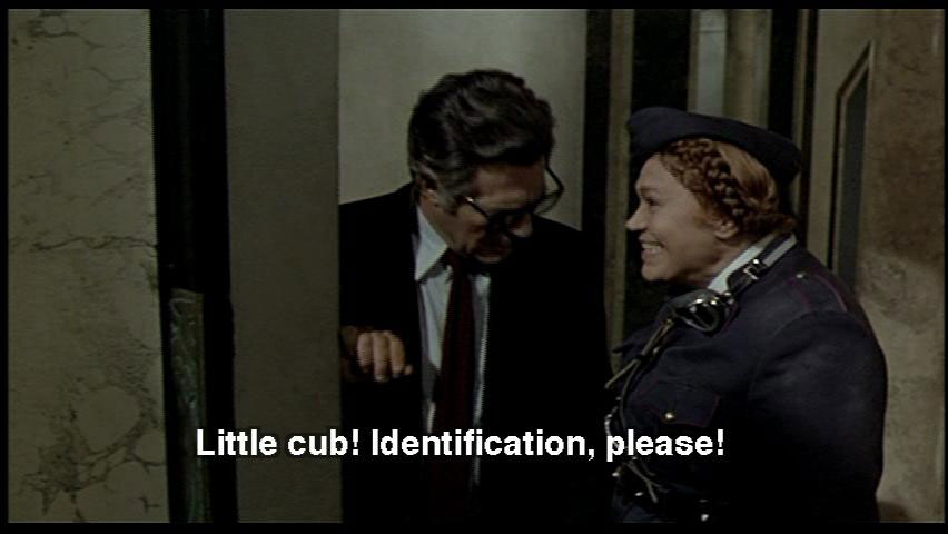 DR. ZUBERKOCK: My beautiful inspector ... your presence does honor my house. May I ...? POLICE: At 8 a.m. tomorrow you will report to Lt. Myrna. She wants to know why you fired upon ... innocent schoolgirls this morning. SHE VULCAN: Little cub! Identification, please!