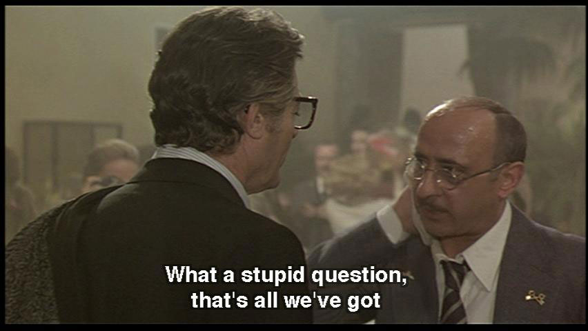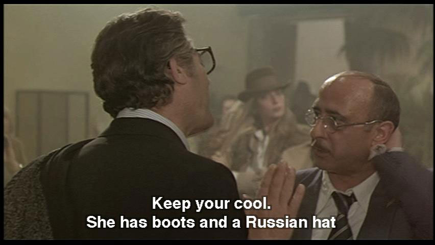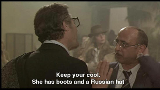 SNAPORAZ: Excuse me, sir ... Did a lady ... MAN: A female lady? What a stupid question, that's all we've got. SNAPORAZ: Keep your cool. She has boots and a Russian hat.