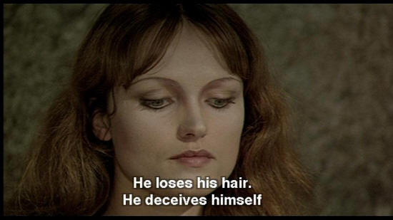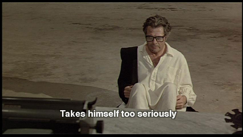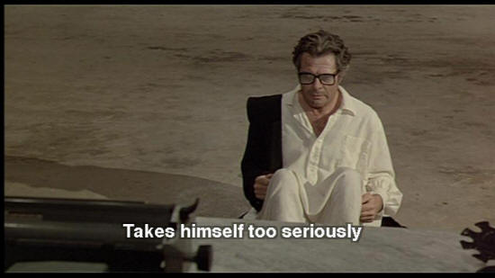 Takes himself too seriously. He never visits his mother. He's guilty ... of "maniacal assophilism." He cannot commit himself to one woman. He loses his hair. He deceives himself ... by imagining an ideal woman.