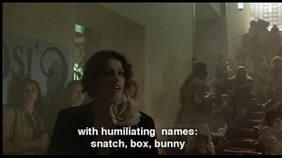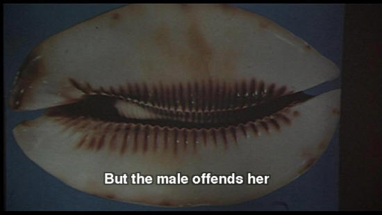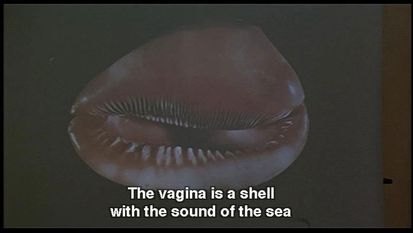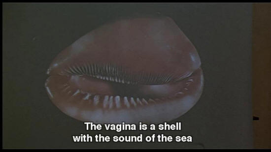 WOMAN: The vagina is a shell with the sound of the sea. You all recall the song of the siren. But the male offends her ... with humiliating names: snatch, box, bunny ... WOMAN: Beaver! WOMAN: Patootie!