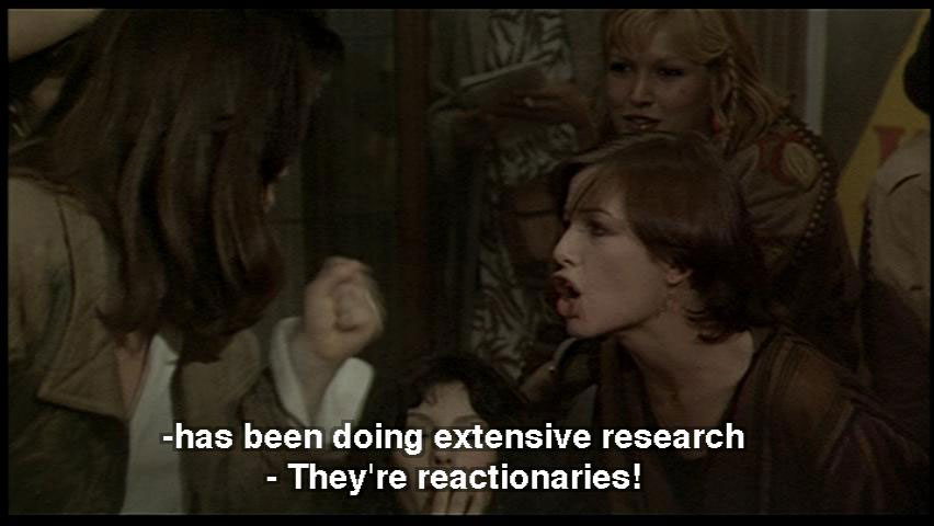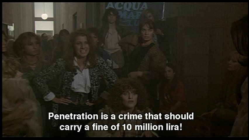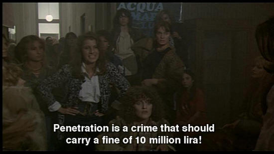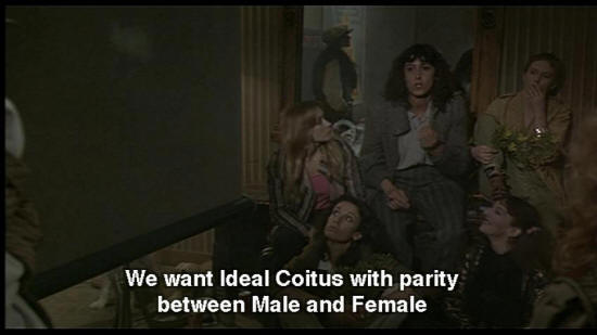 WOMAN: We want Ideal Coitus with parity between Male and Female. WOMAN: Penetration is a crime that should carry a fine of 10 million lira! WOMAN: The Feminist Movement at Columbia University ... has been doing extensive research ... WOMAN: They're reactionaries!