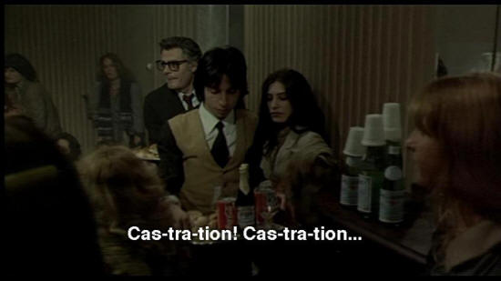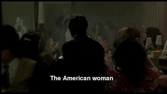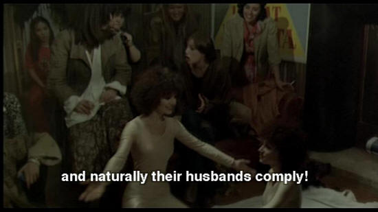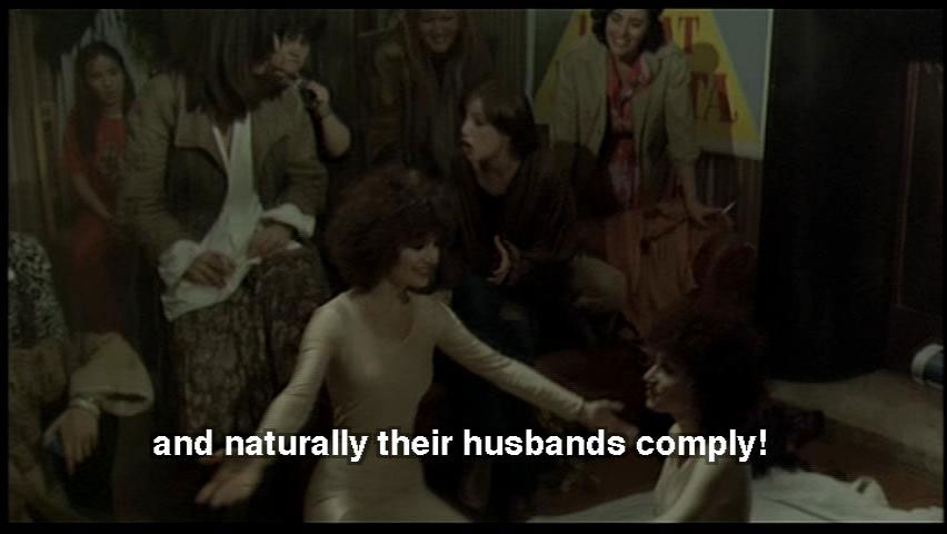 SNAPORAZ: I'll take the tray. Go on, scram. Beat it. WOMEN: Cas-tra-tion! Cas-tra-tion ... WOMAN: The American woman prefers the following position, and naturally their husbands comply!