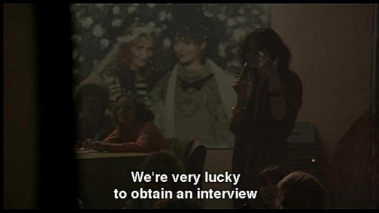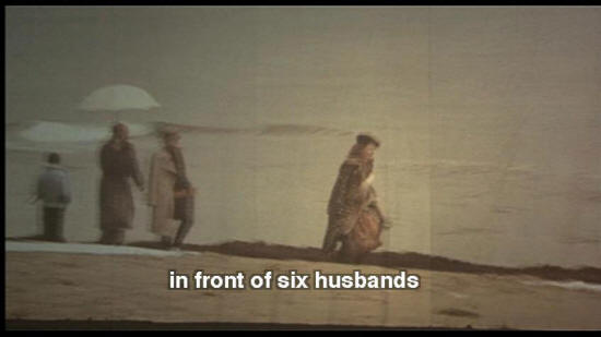 WOMAN: There is Mrs. Small ... jogging ... in front of six husbands. All happy and content. Rare example of feminism inside the family circle. We're very lucky to obtain an interview ... in her house.
