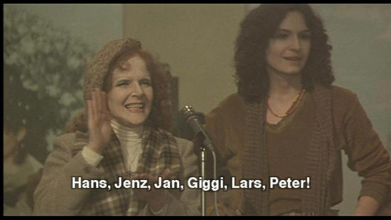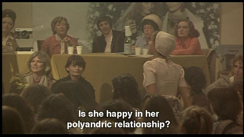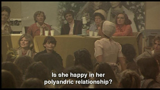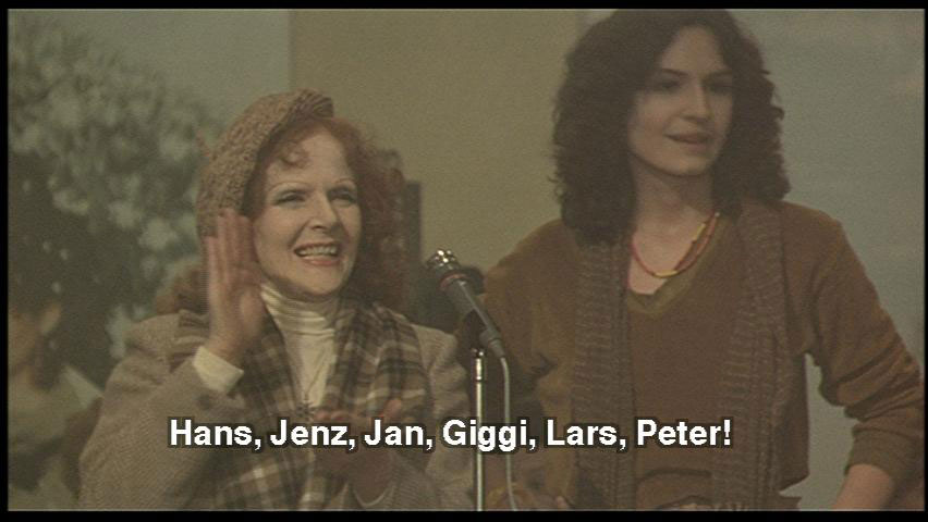 WOMAN: Aren't you a slave to six masters? WOMAN: That's my question too! WOMAN: Is she happy in her polyandric relationship? WOMAN: She said very happy. It's a united family. Now I'll ask where her husbands are. [ENDERBREITH SMALL] Hans, Jenz, Jan, Giggi, Lars, Peter!