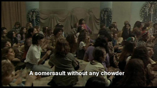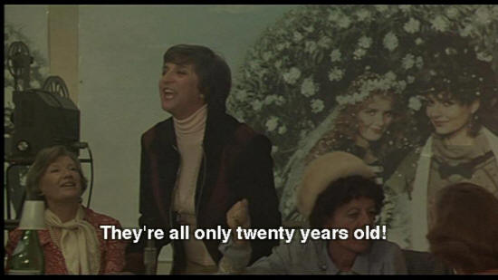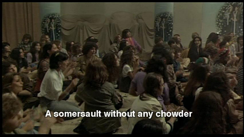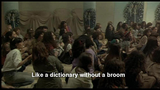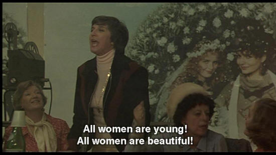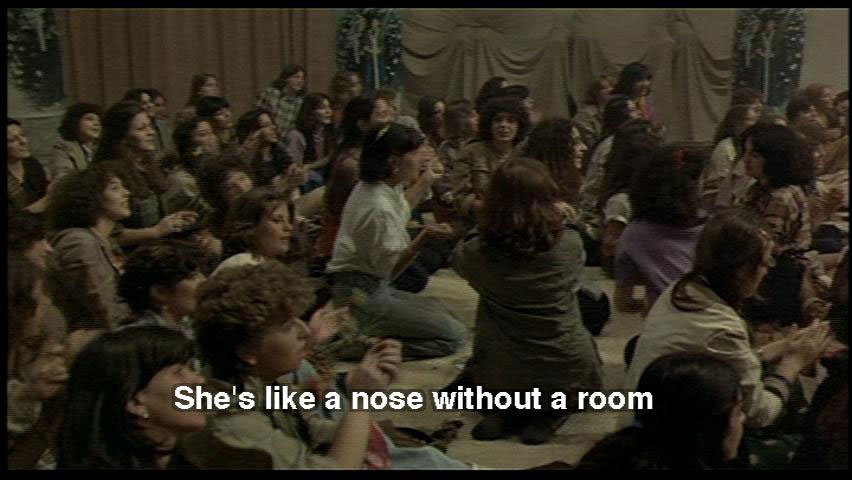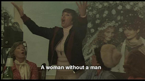 WOMAN: All women are young! All women are beautiful! They're all only twenty years old! WOMEN: A woman without a man ... Is ... She's like a nose without a room. A somersault without any chowder. Like a dictionary without a broom.