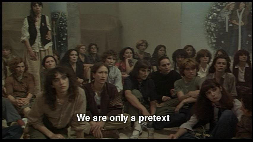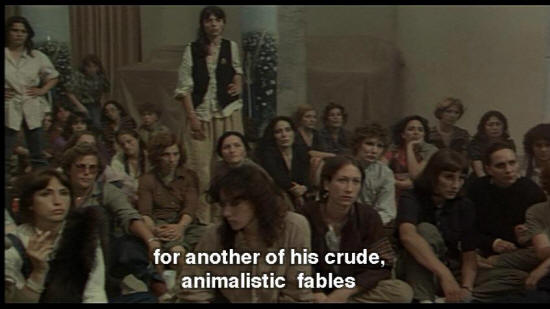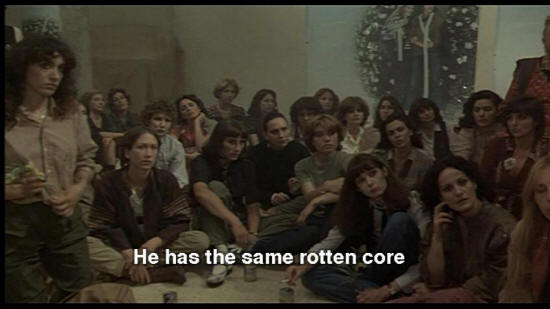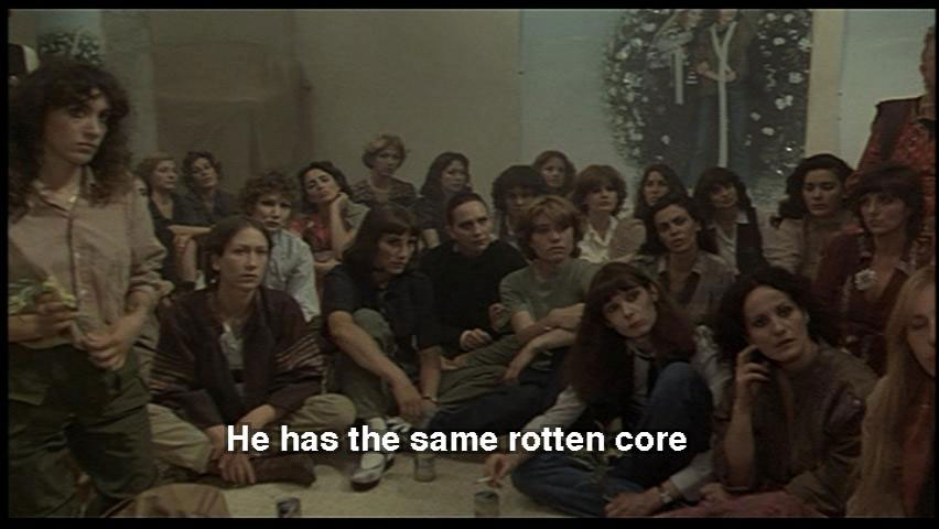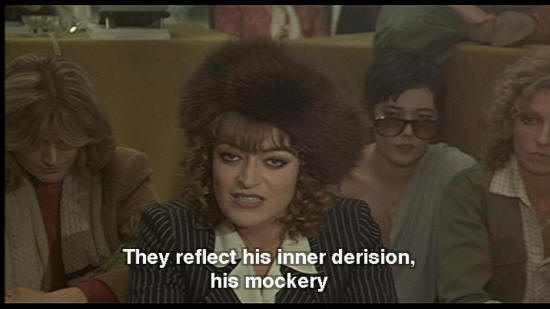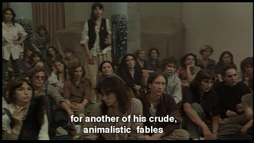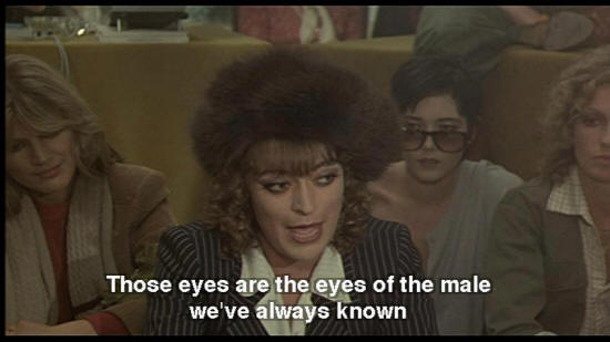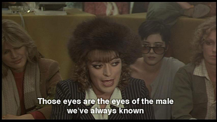 Those eyes are the eyes of the male we've always known. They reflect his inner derision, his mockery. He has the same rotten core. We are only a pretext ... for another of his crude, animalistic fables. Another neurotic song-and-dance act.