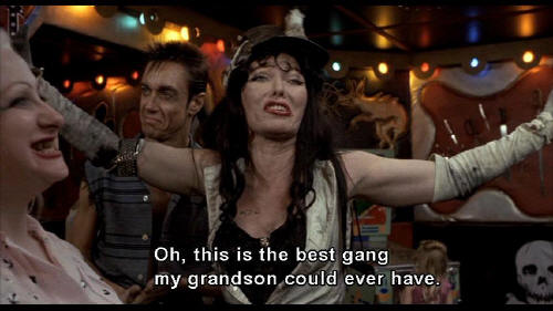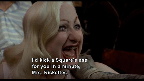 So hard, you could've been eating nails for breakfast. But that's the way a woman's got to be these days. HATCHET: I'd kick a Square's ass for you in a minute, Mrs. Rickettes. RAMONA: Oh, this is the best gang my grandson could ever have. |