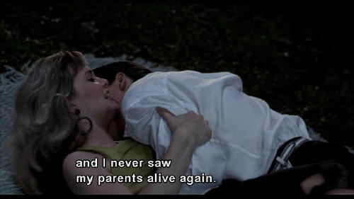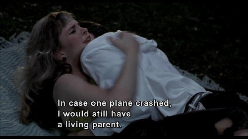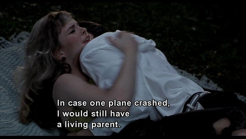Oh, Cry-Baby, your fingers feel so good. WADE: I've been saving it up for a girl like you, honey. ALLISON: Mommy and Daddy took separate planes for safety. In case one plane crashed, I would still have a living parent. but, Cry-Baby, both planes crashed and I never saw my parents alive again. [thunder cracking] |