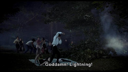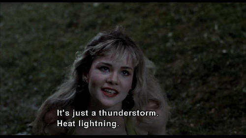 WADE: Goddamn! Lightning! ALLISON: What's the matter, Cry-Baby? WADE: Everything is the matter. ALLISON: It's just a thunderstorm. Heat lightning. It's sexy. WADE: It's not sexy. Electricity makes me insane. ALLISON: Why, Cry-Baby? Why? |