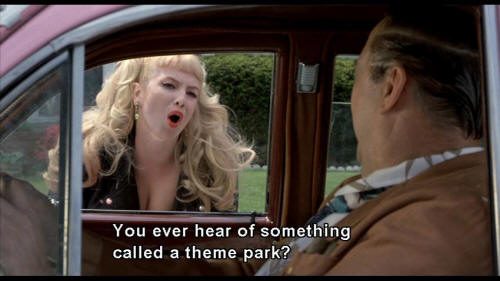 You ever hear of something called a theme park? TOE JOE: Yeah, there's a big opening over there today. WANDA: Well, that's where I'm going, stallion. TOE JOE: Well, hop on in. [laughing] I'm tellin' you women, this ain't no jive If you get too close this man will drive |