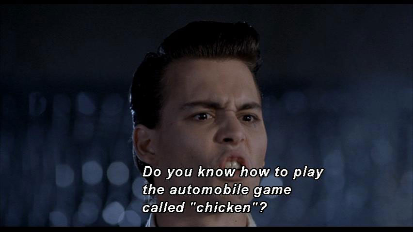 [people agreeing] WADE: It's okay, Hatchet. You're beautiful, baby. [people applauding] But I'll take care of this maggot. Do you know how to play the automobile game called "chicken"? |