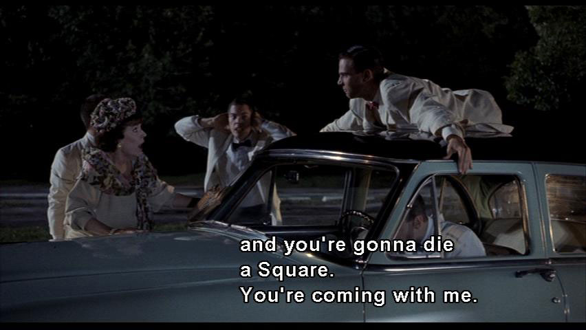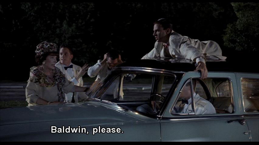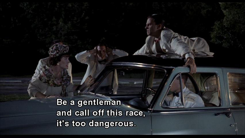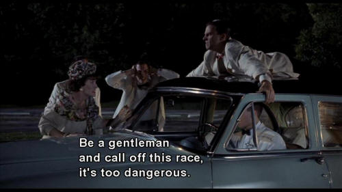 MRS. VERNON WILLIAMS: Baldwin, please. Be a gentleman and call off this race, it's too dangerous. BALDWIN: Mrs. Vernon-Williams, you were born a Square and you're gonna die a Square. You're coming with me. BOY: Come on, lady! Get in the car! MRS. VERNON WILLIAMS: No! |