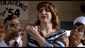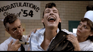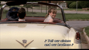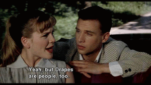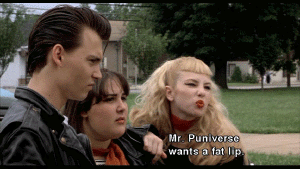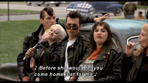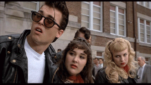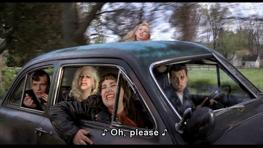 [PEPPER] I think Cry-Baby's got a girlfriend. [MILTON] Cry-Baby and Allison sitting in a tree [WADE] Shut up, Milton. [DRAPES] [laugh] [WANDA] Hey, Hatchet-Face, you think Cry-Baby's got blue balls for the chick? HATCHET-FACE: Allison's a Square, Wanda. Cry-Baby don't dig Squares. [PEPPER] No, she's a "Scrape." Part Square, part Drape. [WANDA] Cry-Baby, want some hooch? [WADE] I don't drink and drive. [tires screeching] [Song playing]