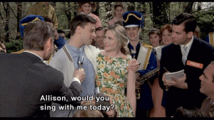 [SQUARES] [cheering] [BALDWIN] Allison, would you sing with me today? *** [Jailbird by Sonny Knight playing]