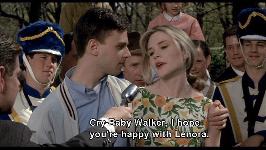 For you make me cry [DUPREE] [singing] Yes, teardrops are falling When you went away [WADE] [singing] My heart is aching And you make [ALL] [singing] Cry don't cry Cry don't cry [WADE] Oooh *** [ALLISON] [gulping tears] [panting] *** [band playing] [SQUARES] [chattering] [GANG WAR IN BALTIMORE] [MALE ANNOUNCER] Call these Drapettes bold, to fellow gang member and known hussy, Lenora Frigid, [LENORA] Cry-Baby is an orphan. [MALE ANNOUNCER] Wade Walker, defiantly entering the Maryland Training
