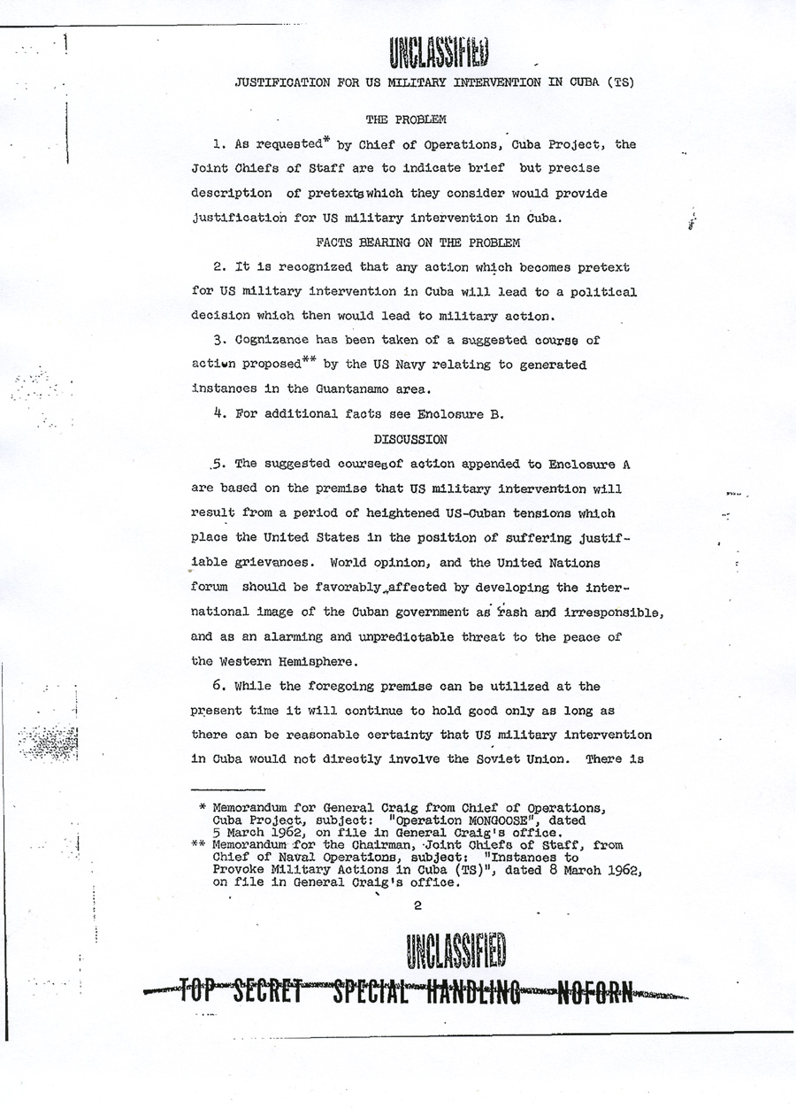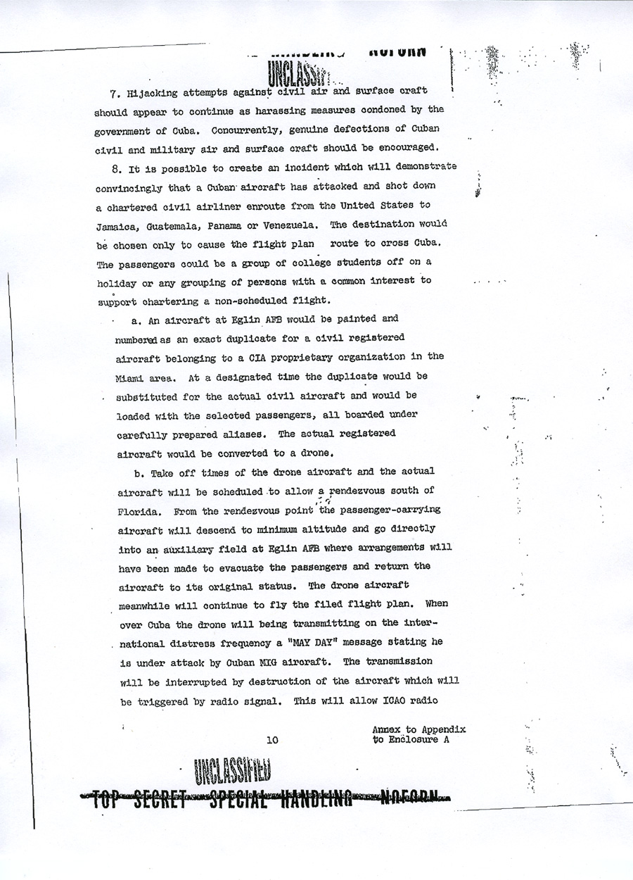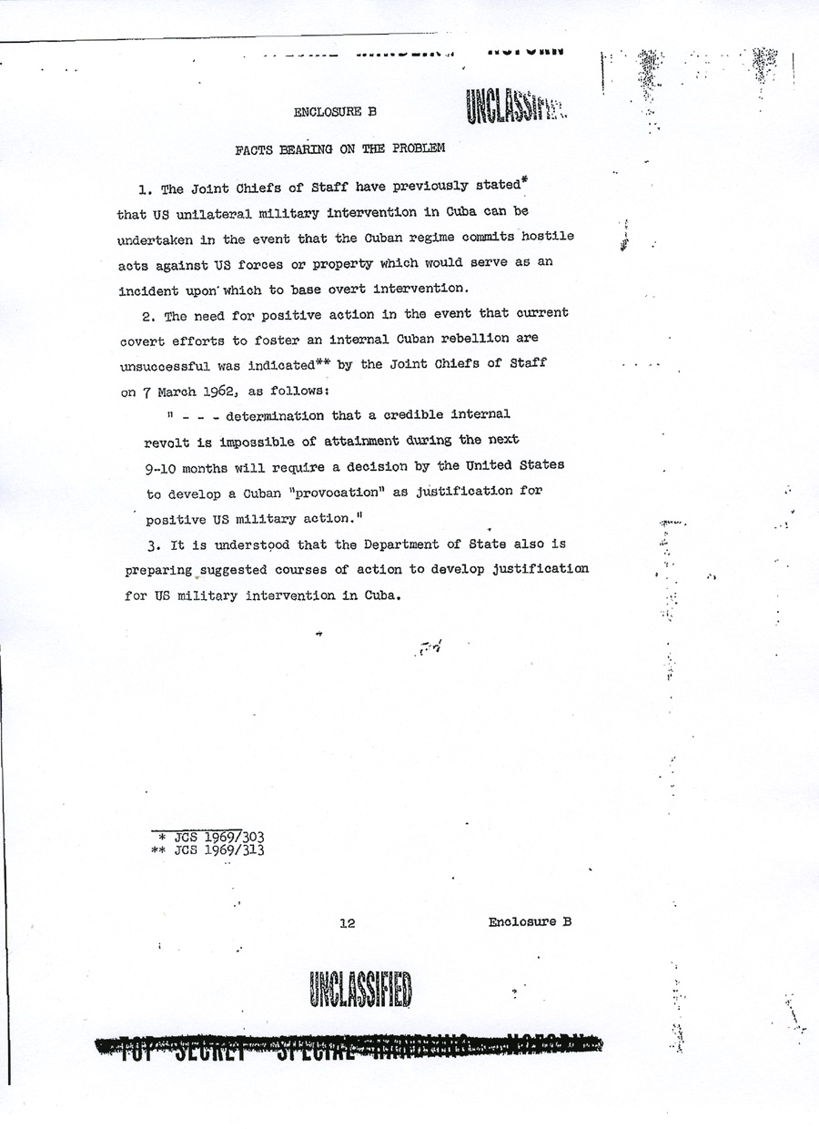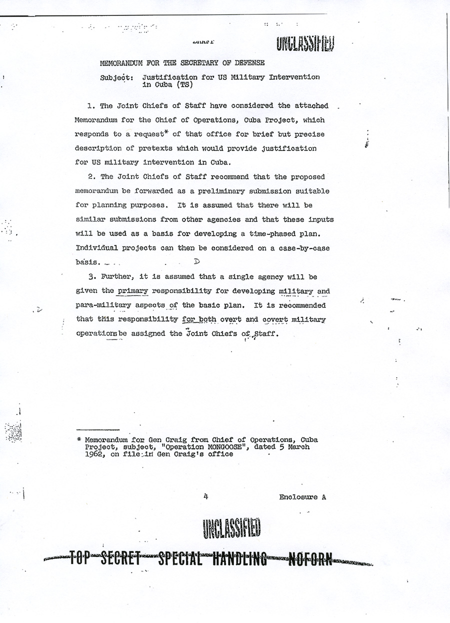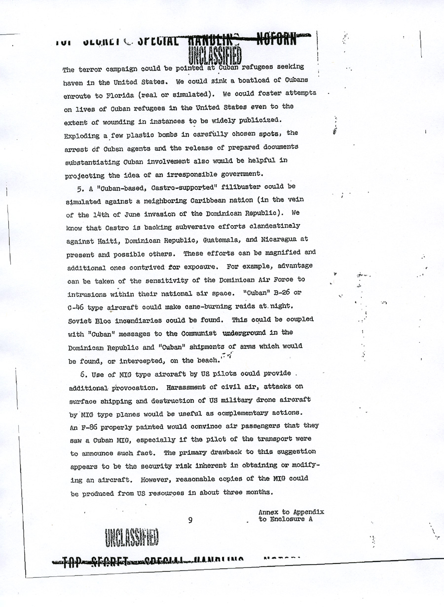 Chief of Operations, Cuba Enclosure A UNCLASSIFIED TOP SECRET SPECIAL HANDLING NOFORN APPENDIX TO ENCLOSURE A DRAFT MEMORANDUM FOR CHIEF OF OPERATIONS, CUBA PROJECT Subject: Justification for US Military Intervention in Cuba (TS) 1. Reference is made to memorandum from Chief of Operations, Cuba Project, for general Craig, Subject: "Operation MONGOOSE", dated 5 March 1962, which requested brief but precise description of pretexts which the Joint Chiefs of Staff consider would provide justification for US military intervention in Cuba. 2. The projects listed in the enclosure hereto are forwarded as a preliminary submission suitable for planning purposes. It is assumed that there will be similar submissions from other agencies and that these inputs will be used as a basis for developing a time-phased plan. The individual projects can then be considered on a case-by-case basis. 3. This plan, incorporating projects selected from the attached suggestions, or from other sources, should be developed to focus all efforts on a specific ultimate objective which would provide adequate justification for US military intervention. Such a plan would enable a logical build-up of incidents to be combined with other seemingly unrelated events to camouflage the ultimate objective and create the necessary impression of Cuban rashness and irresponsibility on a large scale, directed at other countries as well as the United States. The plan would also properly integrate and time phase the courses of action to be pursued. The desired resultant from the execution of this plan would be to place the United States in the apparent position of suffering defensible grievances from a rash and irresponsible government of Cuba and to develop an international image of a Cuban threat to peace in the Western Hemisphere. Appendix to UNCLASSIFIED TOP SECRET SPECIAL HANDLING NOFORN UNCLASSIFIED 4. Time is an important factor in resolution of the Cuban problem. Therefore, the plan should be so time-phased that projects would be operable within the next few months. 5. Inasmuch as the ultimate objective is overt military intervention, it is recommended that primary responsibility for developing military and para-military aspects of the plan for both overt and covert military operations be assigned the Joint Chiefs of Staff. Appendix to UNCLASSIFIED TOP SECRET SPECIAL HANDLING NOFORN ANNEX TO APPENDIX TO ENCLOSURE A PRETEXTS TO JUSTIFY US MILITARY INTERVENTION IN CUBA (Note: The courses of action which follow are a preliminary submission suitable only for planning purposes: They are arranged neither chronologically nor in ascending order. Together with similar inputs from other agencies, they are intended to provide a point of departure for the development of a single, integrated, time-phased plan. Such a plan would permit the evaluation of individual projects within the context of cumulative, correlated actions designed to lead inexorably to the objective of adequate justification for US military intervention in Cuba). 1. Since it would seem desirable to use legitimate provocation as the basis for US military intervention in Cuba, a cover and deception plan, to include requisite preliminary actions such as has been developed in response to Task 33 c, could be executed as an initial effort to provoke Cuban reactions. Harassment plus deceptive actions to convince the Cubans of imminent invasion would be emphasized. Our military posture throughout execution of the plan will allow a rapid change from exercise to intervention if Cuban response justifies. 2. A series of well coordinated incidents will be planned to take place in and around Guantanamo to give genuine appearance of being done by hostile Cuban forces. a. Incidents to establish a credible attack (not in chronological order): (1) Start rumors (many). Use clandestine radio. (2) Land friendly Cubans in uniform "over-the-fence" to stage attack on base. (3) Capture Cuban (friendly) saboteurs inside the base. (4) Start riots near the base main gate (friendly Cubans). Annex to Appendix UNCLASSIFIED TOP SECRET SPECIAL HANDLING NOFORN (5) Blow up ammunition inside the base; start fires. (6) Burn aircraft on air base ( sabotage). (7) Lob mortar shells from outside of base into base. Some damage to installations. (8) Capture assault teams approaching from the sea or vicinity of Guantanamo City. (9) Capture militia group which storms the base. (10) Sabotage ship in harbor; large fires -- napthalene. (11) Sink ship near harbor entrance. Conduct funerals for mock-victims (may be lieu of (10)). b. United States would respond by executing offensive operations to secure water and power supplies, destroying artillery and mortar emplacements which threaten the base . c. Commence large scale United States military operations. 3. A "Remember the Maine" incident could be arranged in several forms: a. We could blow up a US ship in Guantanamo Bay and blame Cuba . b. We could blow up a drone (unmanned) vessel anywhere in the Cuban waters. We could arrange to cause such incident in the vicinity of Havana or Santiago as a spectacular result of Cuban attack from the air or sea, or both. The presence of Cuban planes or ships merely investigating the intent of the vessel could be fairly compelling evidence that the ship was taken under attack. The nearness to Havana or Santiago would add credibility especially to those people that might have heard the blast or have seen the fire. The US could follow up with an air/sea rescue operation covered by US fighters to "evacuate" remaining members of the non-existent crew. Casualty lists in US newspapers would cause a helpful wave of national indignation. 4. We could develop a Communist Cuban terror campaign in the Miami area, in other Florida cities and even in Washington. Annex to Appendix UNCLASSIFIED TOP SECRET SPECIAL HANDLING NOFORN The terror campaign could be pointed at Cuban refugees seeking haven in the United States. We could sink a boatload or Cubans