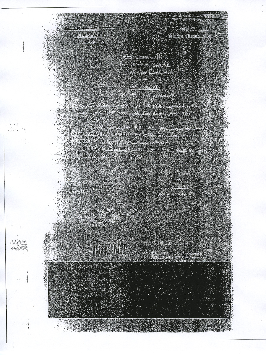 TOP SECRET UNCLASSIFIED COPY No. 1 JOINT CHIEFS OF STAFF DECISION ON JCS 1969/321 A Note by the Secretaries on NORTHWOODS (S) Note by the Secretaries 1. At their meeting on 13 March 1962, the Joint Chiefs of Staff approved the recommendations in paragraph 8 of JCS 1969/321. 2. In that the Commandant had expressed direct concern of the Marine Corps in this matter, the provisions of Title 10, US Code 141 (c), applied and were followed. 3. This decision now becomes a part of and shall be attacked as the top sheet of JCS 1969/321.