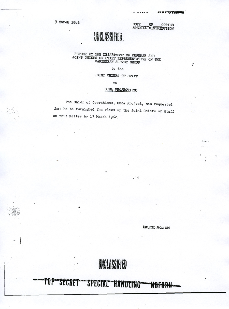 TOP SECRET SPECIAL HANDLING NOFORN THE JOINT CHIEFS OF STAFF UNCLASSIFIED MEMORANDUM FOR THE SECRETARY OF DEFENSE Subject: Justification for US Military Intervention in Cuba (TS) 1. The Joint Chiefs of Start have considered the attached Memorandum for the Chief of Operations, Cuba Project, which responds to a request of that office for brief but precise description of pretexts which would provide justification for US military intervention in Cuba. 2. The Joint Chiefs of Staff recommend that the proposed memorandum be forwarded as a preliminary submission suitable for planning purposes. It is assumed that there will be similar submissions from other agencies and that these inputs will be used as a basis for developing a time-phased plan. Individual projects can then be considered on a case-by-case basis. 3. Further, it is assumed that a single agency will be given the primary responsibility for developing military and para-military aspects of the basic plan. It is recommended that this responsibility for both overt and covert military operations be assigned the Joint Chiefs of Staff. For the Joint Chiefs of Staff: L.L. LEMNITZER SYSTEMATICALLY REVIEWED 1 Enclosure EXCLUDED FROM GDS EXCLUDED FROM AUTOMATIC TOP SECRET SPECIAL HANDLING NOFORN TOP SECRET UNCLASSIFIED COPY No. 1 NOTE BY THE SECRETARIES A report* on the above subject is submitted for consideration by the Joint Chiefs of Staff. F. J. BLOUIN ____________ * Not reproduced herewith; on file in Joint Secretariat EXCLUDED FROM GDS TOP SECRET TOP SECRET 9 March 1962