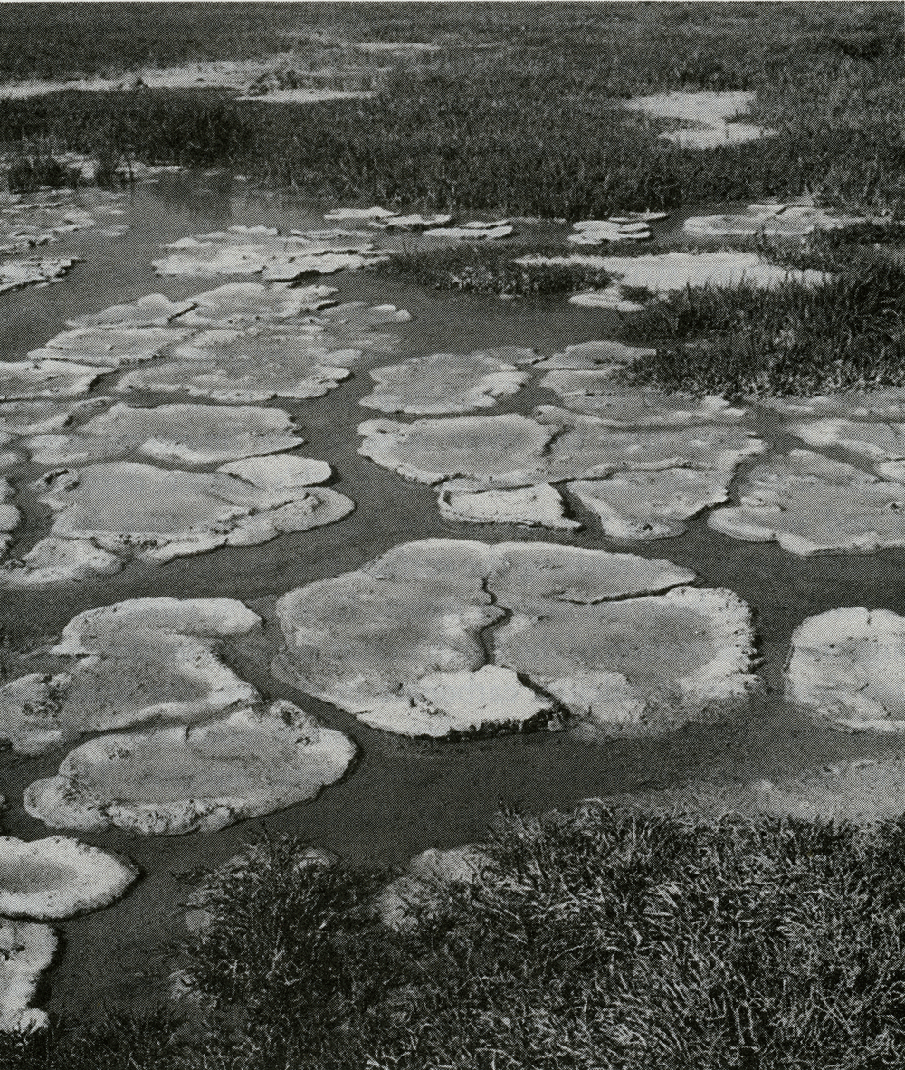 Table 5.1 lists the salts of the oceans. Salt in solution, weathered from the rocks, is entering continuously from the rivers and also from the interior of the Earth at the sea-floor spreading zones that lie at the bottom of all the major oceans. In the ocean, salt is not a single substance, sodium chloride. Rather, it exists as positive sodium and negative chlorine ions, and these behave as two quite independent and separate entities. The sodium ion and the other positive ions of potassium, magnesium, and calcium all have relatively short residence times in the ocean. They are removed by biochemical and chemical processes, and also by hydrothermal chemical reactions within the sea-floor spreading zones, and deposited as sediments, clays, limestones, and dolomite. The salt problem for the biota is actually a problem of getting rid of the negative chloride ions. Chemically, the chloride ion is rather like an atom of the wholly unreactive gas argon. It is a smooth, slippery, spherical molecule with little or no tendency to attach to anything. There is no significant biochemical trade in chlorine. A few strange systems do make methyl chloride from salt, but the turnover of this compound is too small to affect the salinity of the ocean. Also, the chlorine in methyl chloride soon becomes chloride ions again, and is washed out by the rain and returns to the sea. Chloride ions are removed from the oceans physically by the transfer of sea water to the evaporite lagoons. The water trapped in these lagoons warms in the sun and evaporates; the water vapor moves through the atmosphere and eventually condenses elsewhere as rain -- pure water -- that flows into and dilutes the ocean. The salt, represented by the dominant chloride ion and the positive ions that must go with it to keep the total ionic charge zero, is left behind as crystalline layers. These evaporite lagoons are found in many places on the continental margins. Fossil lagoons exist in many places beneath the Earth's surface, sometimes even beneath the ocean itself. Before these lagoons can form, barriers are needed at their seaward boundary. Could this activity be part of the tightly coupled evolution of life and the rocks, or is it just the result of chance? The key process in the formation of these barriers is the deposition of calcium carbonate. The carbon dioxide in the air reacts continuously with alkaline rocks on the land surfaces to form bicarbonates. An important reaction of this type is the one between calcium silicate rock and carbon dioxide dissolved in surface water. The product is a solution of silicic acid and calcium bicarbonate, which flows down the rivers to the ocean. In the absence of life, the calcium and bicarbonate ions can coexist in a mildly acid ocean, and the continuous supply of these would eventually lead to the spontaneous crystalization of calcium carbonate. But it would be more or less randomly deposited over the ocean floor. Limestone deposits in the real world are mostly from the action of living organisms. Limestone is not deposited either randomly or according to the expectations of physics and chemistry. The precipitation of calcium carbonate by colonies of microorganisms occurs most extensively in the shallow waters around the continental margins where the abundance of both nutrients and calcium bicarbonate are highest. Without any planning or foresight, the components of those living structures, the limestone stromatolites, would have assembled offshore and eventually sealed off lagoons from which sea water would be progressively evaporated and salt deposited. At first the reef building would have only a local effect, but over time the sheer mass of the limestone would begin to affect the plastic crust of the Earth's surface, depressing it and so extending the size of the lagoon. New rock formers would always be colonizing the surface of a reef as it descended, so tending to keep the lagoon intact. If, as Don Anderson has suggested, the motion of the Earth's crust depends on the continued deposition of calcium carbonate in the sea, the limestone reefs could have led to the complex events of mountain building and the folding of rocks at the continental margins. This, in turn, would extend the range of shorelines where evaporite lagoons could form. During the course of time salt is being added to the oceans from the lithosphere and removed again. Some of this salt is deposited in evaporite beds and buried beneath sediments. These deposits may be a temporary store which Earth movements and weathering continuously expose and release the contents of back to the sea; but new evaporite lagoons are always forming. The balance of erosion and formation seems always to have kept enough salt sequestered in evaporite beds to keep the oceans fresh and fit for life. The evidence that lagoon formation and maintenance depends on the specific behavior of marine micro' organisms is strong. 5.1 The evaporite lagoons at Laguna Figueroa, Baja California, Mexico. Sand dunes form a barrier through which sea water percolates. The water then evaporates in the lagoons, and salt crystallizes out to form an evaporite deposit. The surface of the lagoons are often covered by microbial cell communities called mats. I once had the pleasure of joining an expedition, led by Lynn Margulis, to the microbial mat communities that form in the evaporite lagoons of Baja California in Mexico (as shown in figure 5.1). They are on the western edge of that long, narrow tongue of land that hangs down below San Diego and separates the Gulf of California from the Pacific Ocean. Here I was able to see at first hand the subtle economy of the bacterial mats that covered the lagoon. The red and green communities of microbes at the surface acted as a raincoat, preventing the salt from being dissolved in the rain and washing back into the ocean. Indeed, on one occasion, the whole lagoon was flooded by feet of fresh water. Within two years the flood was 