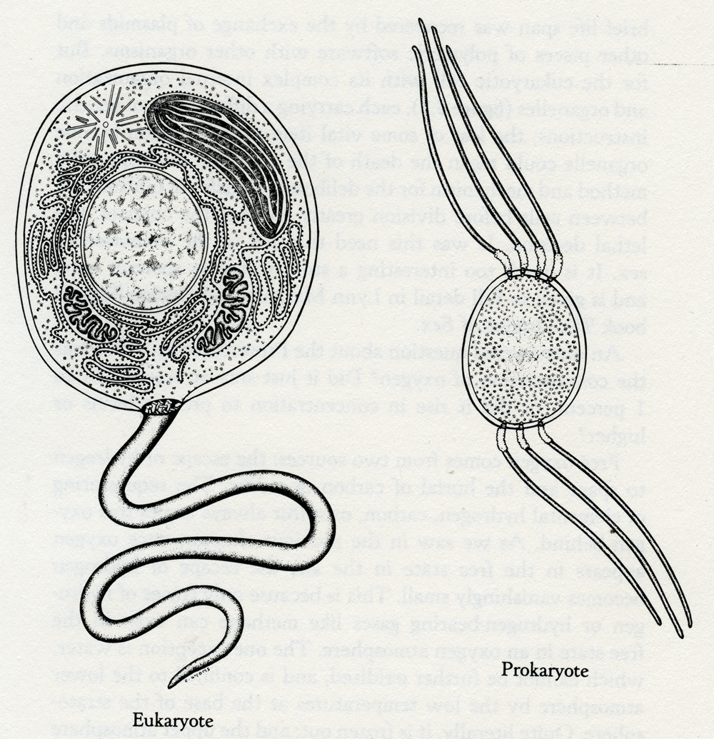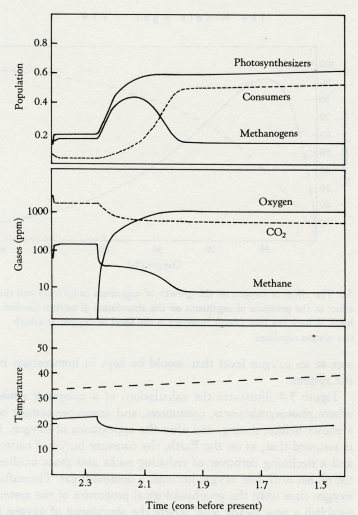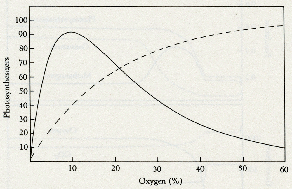 To me this is an exciting idea, but I admit that most geologists find it extremely improbable. The event may have begun with the activity of a few organisms able to split a dilute solution of calcium bicarbonate into chalk and carbon dioxide, and so avoid calcium poisoning. We do not know when plate tectonics started. If it is connected with life, that connection may not have existed before the development of the intracellular precipitation of calcium carbonate in eukaryotes, late in the Proterozoic. The study of the intricate biological processes for segregating and concentrating the elements of the crust and ocean in the form of minerals has become a separate topic of the Earth sciences called biomineralization. Salt regulation is one of the most interesting and tantalizing Gaian systems. There are few organisms able to tolerate salt at concentrations above about 6 percent by weight. Have the oceans always kept below this critical limit of salinity by chance? Or has the tightly coupled evolution of life and the environment led to the automatic regulation of ocean salinity? It is often stated that the preferred internal saline medium of living things, one that is astonishingly similar over a very wide range of organisms, reflects the composition of the oceans when life started. It is true that the salinity of the blood of whales, humans, mice, and of most fish, whether dwelling in the ocean or in fresh water, is the same. Even the circulating fluid of Artemia, the brine shrimp that lives in saturated salt solutions, shares with us the same internal salinity. But to my mind this is no more evidence of the salinity of the Archean ocean than are the oxygen levels now breathed by these organisms evidence of the oxygen abundance at the start of life. Most cells survive and do best in a medium whose salinity is 0.16 molar (about one percent by weight in water, or normal saline). Many kinds of cells survive the salinity of sea water, 0.6 molar, but above 0.8 molar the membranes that hold the precious interior contents of cells become permeable or disintegrate completely. The reason for the destructive action of salt solutions is simple. Cell membranes are held together by the same kind of forces that hold together a soap bubble. Quite often these forces are very sensitive to the salinity of the medium, usually being weakened when the salinity is high. You can see this for yourself by making bubbles with increasingly strong salt solution as the solvent for the soap. Above about 10 percent salt, bubbles cannot be made. This is because soap molecules are made up of a long chain of carbon atoms tightly linked together and surrounded by hydrogen atoms equally firmly held. These chains are terminated at one end only by a carbon atom with two oxygen atoms attached. When this end of the soap molecule is dissolved in water that is slightly alkaline, as all soap solutions are, it carries a negative charge. The negative electrical charge makes the end group attract water molecules and drags the insoluble oily hydrocarbon chain into solution. Salt is made up from negative chlorine ions and positive sodium ions. When there are many of these in solution they begin to compete with the soap's negative charge for the water molecules. When enough salt is present, the soap separates from the water as curd. The molecules of a cell membrane are more complex than soap: they include such substances as sterols (for example, cholesterol), hydrocarbons, proteins, and phosphatides. The molecules of phosphatides correspond to those of soap, and are the part of the membrane most affected by an increase in salt concentration. High salt concentrations disrupt cell membranes by disturbing the electrical forces holding the membrane in its correct and complex state. The membrane of the human red blood cell, for example, is made up of more or less equal parts of cholesterol and lecithin (a phosphatide) and a mixture of protein and other fatty substances. The red blood cell will survive exposure to salt solutions up to 0.8 molar (4.7 percent by weight in water). Above this strength the membrane is damaged, and at concentrations above 2.0 molar the cell may be destroyed in seconds. In the mid-1950s I was able to show by direct experiments that the damage to red blood cells commenced when lecithin dissolved away from the membrane into the strong salt solution. This kind of salt damage seems general among living cells and is seen with the cells of all five kingdoms. The salt concentration of today's sea is always uncomfortably high for living organisms. The larger ones, such as fish, swimming mammals, and some crustacea, have physiological mechanisms to regulate the internal salt at a level close to that of their own bodies (0.16 molar). To prevent the loss of water from their internal medium (osmosis), these animals have to work to stop themselves being squeezed dry by the osmotic pressure. They have to use energy to pump water in against the osmotic pressure difference between their interior and that of the sea. The pressure is close to that needed to pump water 450 feet vertically against gravity, over a thousand times the blood pressure of humans. The advantages of a low-salt interior must be considerable to require such an effort to sustain it. For the small cell of a bacterium, individual regulation is a luxury far beyond its means. This does not just apply to salinity. Take temperature for example: for a microorganism to sustain even a 1°C difference from that of its environment would require the consumption of far more food and oxygen than could cross its surface. Not only this, but a 1° temperature gradient across the cell membrane would generate a thermal osmotic pressure of 56 atmospheres, or 840 pounds per square inch; far beyond the strength of a cell membrane to resist. The most frequent experience of salt stress is in drying or freezing. When cells freeze, water is removed as pure ice and the salt solution in which