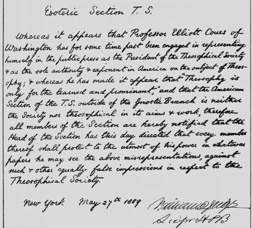 1. The Head of the Section desires therefore, to inform all members of the E.S. that Prof. Coues has no authority, except his own, for assuming such a title; that he is not, & never has been, a member of Esoteric Section to which you belong; & that no papers, documents, memoranda or teachings given in this section must be shown or communicated to him. 2. Having learned that a memorandum dated March 17th 1889, relating to the duty which is incumbent on members of the E.S. to defend the T.S. & its leaders, has got into the hands of Col. Bundy of the Religio-Philosophic Journal, the Head of the Section desires to say that should any Member of the E.S. know how this has happened, it is his duty to communicate at once with the Council (vide memorandum appended to Instruction No 2). Should such a breach of faith ever occur again, the Esoteric Section will at once be broken up & all further instruction cease. It is therefore the duty of all who desire its continuance to exercise the greatest possible care & circumspection. 3. In order to prevent any mistake or deception arising as to membership in the E.S., the Head of the Section has selected the following Passwords: --- The member desiring to ascertain whether another person belongs to the E.S. will first say “Dhyani” to which the person addressed (if a member of the E.S. will reply “Pura”. The questioner must then say “Satri”, to which the reply will be “Asoph”. No member must ever speak or discuss the teachings given in the E.S. or any of its confidential documents with any person to whom he has not previously given these Pass-words, & received from him the correct replies as given above. The Head of the Section (signed) H.P. Blavatsky For the Council *** E.S.T.S. DOCUMENT SIGNED MAY 27, 1889 BY WILLIAM Q. JUDGE (FACSIMILE OF ORIGINAL) Esoteric Section T.S. Whereas it appears that Professor Elliott Coues of Washington has for some time past been engaged in representing himself in the public press as the President of the Theosophical Society & as the sole authority & informant in America on the subject of Theosophy; & whereas he has made it appear that Theosophy is only for the learned and prominent, and that the American Section of the T.S. outside of the Gnostic Branch is neither the Society nor theosophical in its aims & work, therefore all members of the Section are hereby notified that the Head of the Section has this day directed that every member thereof shall protest to the utmost of his power in whatever papers he may see the above misrepresentations, against such & other equally false impressions in respect to the Theosophical Society. New York, May 27th, 1889. *** E.S.T.S. DOCUMENT SIGNED MAY 27, 1889 BY AMERICAN E.S. COUNCIL To Members of the Esoteric Section It has already been stated that the Esoteric Section was established in order "to help the future growth of the Theosophical Society as a whole, in the true direction, by promoting brotherly union, at least among the few." (See Prelim: Memo: p. 9). To secure real & beneficial harmony two coincident processes are necessary on the part of every member. Each must do some fraternal & unselfish work for all, while striving at the same time to develope in himself a higher realization of Universal Brotherhood, in accordance with the Instructions received through Madame Blavatsky. The Head of the Section having inaugurated the promised course of teaching, it remains for the section to set about fulfilling that part of its Pledge which relates to active work for the cause of Humanity. No less important is it that the true spirit of charity & universal love should be steadfastly maintained. Where this has not been done, the Section has been weakened as a whole, deprived in due measure of fuller Esoteric Instruction. It should be clearly understood that the violation, by any & every member of the full spirit of the Pledge, not only injures himself, but reacts upon the entire Section. Such penalties may be said to mainly consist in the deprivation of interior enlightenment, against which they have themselves closed the door of their inner nature. At the same time there may be special & harmful results arising from specific deeds, but these are in all cases provided for by Divine Laws, & not by any Being, however great. Thus in the case of work promised and not undertaken, the infringement of the solemn vow will be felt by one & all. And here the last warning by H.P.B. as to discontinuance of the teaching if there be further violation of the Pledge, is important. For these reasons the American Council repeats to each member the injunctions of the Head of the Section, as a preliminary to organization with a view to united work. You are hereby requested to give your thoughtful attention to this question, viz: What theosophical work are you able & ready to engage in? There is no one who cannot do something, & it is the quality of work done, its motive and earnestness, rather than its quantity per se, which engenders energy potent upon the real flames of Being. Where some one line of work can be entered upon & systematically carried out by any member, this course commends itself to the practical judgement, but it is not insisted upon. The vital point is that you should decide what you can do & give. Branch work; financial aid; spreading our literature, writing; teaching children; helping inquirers by correspondence or otherwise; watching such journals as you may be in the habit of seeing, in order to reply to any unjust strictures upon Theosophy. All these & many other methods of rousing the world to a perception of Truth are useful & easily available. In the environment & circumstances of each member will be found an indication of the work he can best do, if he will diligently & ardently seek it. You are requested to report to any of the signers hereof who may be nearest to you stating your views & efforts in the above respect. You may also ask for any information, suggestio