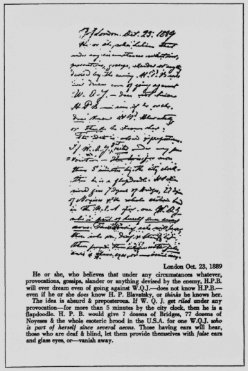 “ATTENTION, THEOSOPHISTS!” This is what we said in Lucifer:— Grotesque contrasts and paradoxes are the very pith of our age. We might, therefore, permitting ourselves for once to follow suit, publish under the above title certain very untheosophical activities. But we prefer to leave the pages of our Lucifer untainted with the recital of untheosophical backbiting, malicious calumnies and attempts to ruin our character. Those who would learn our answer (and that of trustworthy witnesses) to the slanders that find such a ready hospitality in a spiritual organ of America, are invited to turn to Light of June 1st, and June 8th, 1889. All attacks would have been ignored and never mentioned could they without danger to the Theosophical Society, but be relegated by us to that common pit of oblivion, in which crawl and hiss, struggling to come to light, all the venomous monsters bred by calumny, envy, hatred, and revenge—most of them the progeny, alas, of those who, once upon a time, took pride in calling themselves, Theosophists(!!) The old truism, that they whom the gods would destroy, they first make mad, is once more vindicated. Calumnies are effective only on the condition that they should not be so readily refuted. It is easy enough to bear false witness against one who is unable to establish an undeniable alibi. It is as easy for a traducer to charge a person with having said or done that or the other, at a date when the accused and the accuser were both in the same country, if not in the same town. The credibility and likelihood of such accusations become, however, rather shaky if the accused party can furnish precise dates—awkward things to deal with—corroborated by numbers of persons to the effect that at the date mentioned he was 10,000 miles away, and did not even hold any correspondence with the accusing party. “One lie must be thatched with another, or truth will soon rain through,” says a proverb. The London Light, always fair to all, was forced to publish—or rather to republish from the Chicago Religio-Phil. Journal—a very strange letter. We may even say two letters in one, as the reader will see for himself. We call it “strange” because it is so transparent in its animus, so very imprudent and so easily refuted that both the writers—intellectual, and hoary with life-experience as they really are—seem to give themselves entirely away for a mere song, for the pleasure, one would almost say, of inflicting an ugly scratch, whether it reaches the person aimed at, or simply produces a commotion among the innocent and the credulous ones who believe all they read. So evident are the motives of this joint production—spite and revenge—that, were we certain that no true theosophist would be thereby affected, we would have never gone out of our way to refute the silly invention. It seems almost undignified to even notice it, but truth had to be shown at all costs. And this is the cutting from the R.-P. J. that was sent to us a few days ago, and referred to above. The reader will please notice the underlined passages. ATTENTION, THEOSOPHISTS! A LITTLE MORE “LIGHT ON THE PATH” FOR YOUR BENEFIT. SIR:—In 1885 appeared a strange little book entitled: Light on the Path: A treatise written for the personal use of those who are ignorant of the Eastern Wisdom, and who desire to enter within its influence. Written down by M.C., Fellow of the Theosophical Society. The author is Mabel Collins, until lately one of the editors of Lucifer. The book is a gem of pure spirituality, and appears to me, as to many others, to symbolize much mystic truth. It has gone through numberless editions, and is used by faithful Theosophists much as orthodox sinners use their prayer-book. This happened mainly [4] because “Light on the Path” was supposed to have been dictated to Mrs. Collins by “Koot Hoomi,” or some other Hindu adept who held the Theosophical Society in the hollow of his masterly hand. I liked the little book so much that I wrote Mrs. Collins a letter, praising it and asking her about its real source. She promptly replied, in her own handwriting, to the effect that “Light on the Path” was inspired or dictated from the source above indicated. This was about four years ago; since which time nothing passed between Mrs. Collins and myself until yesterday, when I unexpectedly received the following letter. I was not surprised at the new light it threw on the pathway of the Theosophical Society, for late developments respecting that singular result of Madame Blavatsky’s now famous hoax left me nothing to wonder at. I cabled Mrs. Collins yesterday for permission to use her letter at my discretion. Her cablegram from London reached me this morning, saying, “Use my letter as you please. Mabel Collins.” So here is the letter. April 18th, 1889. You will remember writing to me to ask me who was the inspirer of “Light on the Path.” If you had not been yourself acquainted with Madame Blavatsky I should despair of making you even understand my conduct. Of course I ought to have answered the letter without showing it to any one else; but at that time I was both studying Madame Blavatsky and studying under her. I knew nothing then of the mysteries of the Theosophical Society, and I was puzzled why you should write to me in such a way. I took the letter to her; the result was that I wrote the answer at her dictation. I did not do this by her orders; I have never been under her orders. But I have done one or two things because she begged and implored me to; and this I did for that reason. So far as I can remember I wrote you that I had received “Light on the Path” from one of the Masters who guide Madame Blavatsky. I wish to ease my conscience now by saying that I wrote this from no knowledge of my own, but merely to please her; and that I now see I was very wrong in doing so. I ought further to state that “Light on the Path” was not to my knowledge inspired 