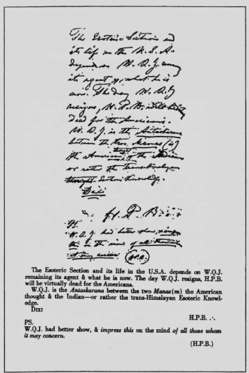 PS. W.Q.J. had better show, & impress this on the mind of all those whom it may concern. (H.P.B.) *** H.P. BLAVATSKY ON THE ESOTERIC SECTION "Having read your manifesto [dated Oct. 9, 1889 addressed to W.Q. Judge] herewith attached, permit me, before we part on the Esoteric field, you having placed yourself outside, and I, remaining within, to give you my impressions thereon. I must beg you to TRY to believe me when I say that they are expressed by one who, whatever you may say and do, knowing your inner nature better than you do yourself, has, and will go on having, the most sincerely fraternal and sympathetic feelings for you. To that Inner Mr. Bridge I say: 'I have the greatest esteem for your sincerity.' To the personal Mr. Bridge I proclaim:--- "'Beware, you have the PLEDGE-FEVER; but have no idea you have it.' You think all the feelings expressed in this manifesto are your own? One day you will find out that they were most insidiously grafted on your sensitive nature by the greatest enemies of Theosophy, of the T.S., and of my insignificant personality .... "'The hero-worship paid her' (H.P.B., or rather its idea, has originated with Dr. Elliot Coues, and has been canvassed vigorously by that person in the U.S.A ....Nor could any member of the Theosophical Society revolt [more] in his heart against 'hero-worship' than H.P.B. would on the day that she would find it in the heart of any Theosophist; which, so far, she has not .... "H.P.B. is not, nor ever was, the 'Theosophical Society'. But she is beyond doubt or cavil, the head of the E.S. of the T.S.; and if she drops it in the U.S.A. (she will never do so in England or India) then the Esoteric Section in that country would go with her. Only, carrying out the orders of the MASTER and MASTERS she is forced to go on even in the U.S. with the Esoteric teachings so long as there is one Esotericist FAITHFUL to his PLEDGE. And believe me dear Mr. Bridge, if 200 members were to follow your example and drop out of the E.S. a week later there would be 400 to replace them. For Truth must prevail, and there are as many earnest Esotericists, loyal to their Pledge to their Higher Self, and faithful to the Masters to death, who will therefore, do what any may, remain true to their old Teacher----the humble servant of the said MASTERS.". "...It is evident from your quotation of a paragraph in Olcott's editorial that he proclaims his most unqualified and unequivocal loyalty to, and recognition of, the MASTERS. And as you quote it with approbation, you evidently share this belief, so far at least, as to recognize in Them the real founders of the T.S. And if you do, what position do you take up with regard to their two humble servants? If you shout against Hero-Worship in my case, surely in justice you must do the same against Olcott in India, as he is a thousand times more reverenced and beloved in India than I ever was by anyone in the U.S.A. that I know of! One thing of two you have to choose. Either it is the Masters, or we two, who have founded the T.S. If the former, would They have chosen unworthy vehicles and Agents for the Exoteric work and the handing on of their precious heirloom of Wisdom and Science to Humanity? And if the latter, then the Theosophical Society is H.P.B. on the Esoteric plane, and H.S. Olcott and W.Q . Judge on the Exoteric plane. Thus you are condemned out of your own mouth to hold fast to your first proposition. And if you do, then it is your right duty to make the burden which presses on, already too heavily, the shoulders of the undersigned lighter, instead of heavier, by playing into the hands of such cruel, unscrupulous, and vindictive enemies of Theosophy as E.C. and M.C. "Think well, before you substitute for what you imagine to be 'Hero-Worship' the worship of SELF or personal prejudices, as embodied in your manifesto. Meanwhile, let us part for the present, Ever your Friend, "W.Q. Judge will put and lock in a safe the certificate of John Ransom Bridge, with the written remark 'resigned'. After such manifesto it is evident he cannot and shall not remain in the Esoteric Section. But this does not prevent, so far, his being an honest though a delirious man. Please notify Griggs. H.P.B. Letter dated late Oct. 1889 to John Ransom Bridge *** H.P. BLAVATSKY ON THE ESOTERIC SECTION "Bridge? Let him go to the devil & Noyes along with him, if he believes [1] in himself so much. My answer to his printed manifesto the copy of which I sent you will show you that I tell him plainly that it is all Pledge Fever & personality on his part.---Self-worship combating hero- worship for somebody else. He is an honest & sincere man, however, and I repeat so again. But he cannot believe in M.C.' s guilt & Baxter is behind his back. What do I mean by your playing into Lanes and Coues' hands? What I say. Coues will give half his wife's fortune to crush you, myself & Society. He tries to set us two at logger heads as Mrs. Ver Plank truly remarks. Let us defeat them (for Lane is Coues' creature) by remaining as united as the five fingers on one hand ...." H.P. Blavatsky _______________ Notes: 1. Following this, on the top of the second page of the second sheet of H.P.B.'s letter, written upside down, is the following:] "Master's last letter made me very miserable & I am hardly getting over it. Damn, my weakness for the fools!" *** H.P. BLAVATSKY ON THE ESOTERIC SECTION "In answer to your letter I can only say as follows: if W.Q. Judge, the man who has done most for Theosophy in America, who has worked most unselfishly in your country and has ever done the biddings of Master the best be knew how, is left alone in his righteous law-suit ...and if the Aryan Society in general and its Esotericists especially leave him alone, without their unanimous moral support, which is much more than their money, then I say, let them go! They are NO true Theosophists, because they care nothing for their honour, the honour and fair name of their Society. And