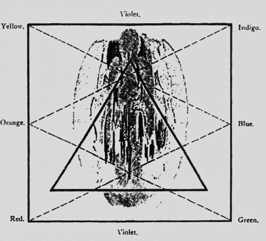 INSTRUCTION NO. II A. Violet. (a) Si. B. (Orange) Red. (a) Do. A. (a) The Astral Double of Nature, or the Paradigm of all Forms. (b) Divine Ideation, or Universal Mind. (c) The Synthesis of occult Nature, the Egg of Brahma, containing all and radiating all. (d) Animal or Material Soul of Nature, source of animal and vegetable intelligence and instinct. (e) The aggregate of Dhyan Chohanic Intelligences, Fohat. (f) Life Principle in Nature. (g) The Life Procreating Principle in Nature. That which, on the spiritual plane, corresponds to sexual affinity on the lower. Mirrored on the plane of Gross Nature, the World of Reality is reversed, and becomes on Earth and our plane: B. (a) Red is the colour of manifested dual, or male and female. In man it is shown in its lowest animal form. (b) Orange is the colour of the robes of the Yogis and Buddhist priests, the colour of the Sun and Spiritual Vitality, also of the Vital Principle. (c) Yellow or radiant Golden is the colour of the Spiritual, Divine Ray in every atom; in man of Buddhi. (d) Green and Red are, so to speak, interchangeable colours, for Green absorbs the Red, as being threefold stronger in its vibrations than the latter; and Green is the complementary colour of extreme Red. This is why the Lower Manas and Kama Rupa are respectively shown as Green and Red. (e) The Astral Plane, or Auric Envelope in Nature and Man. (f) The Mind or rational element in Man and Nature. (g) The most ethereal counterpart of the Body of man, the opposite pole, standing in point of vibration and sensitiveness as the Violet stands to the Red. PLATE II. The above is on the manifested plane; after which we get the seven and the Manifested Prism, or Man on Earth. With the latter, the Black Magician alone is concerned. In Kosmos, the gradations and correlations of Colours and Sounds, and therefore of Numbers, are infinite. This is suspected even in Physics, for it is ascertained that there exist slower vibrations than those of the Red, the slowest perceptible to us, and far more rapid vibrations than those of the Violet, the most rapid that our senses can perceive. But on Earth, in our physical world, the range of perceptible vibrations is limited. Our physical senses cannot take cognizance of vibrations above and below the septenary and limited gradations of the prismatic colours, for such vibrations are incapable of causing in us the sensation of colour or sound. It will always be the graduated septenary and no more, unless we learn to paralyze our Quaternary and discern both the superior and inferior vibrations with our spiritual senses seated in the upper Triangle. Now, on this plane of illusion, there are three fundamental colours, as demonstrated by physical Science: Red, Blue, and Yellow, (or rather Orange-Yellow). Expressed in terms of the human principles they are: (1) Kama Rupa, the seat of the animal sensations, welded to, and serving as a vehicle for the Animal Soul or Lower Manas (Red and Green, as said, being interchangeable); (2) Auric Envelope, or the essence of man; and (3) Prana, or Life Principle. But if from the realm of illusion, or the living man as he is on our Earth, subject to his sensuous perceptions only, we pass to that of semi-illusion, and observe the natural colours themselves, or those of the principles, that is, if we try to find out which are those that in the perfect man absorb all others, we shall find that the colours correspond and become complementary in the following way: