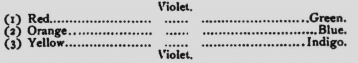 PLATE III. NOTE (a). -- The numbers attached to the circles are for purposes of reference only. They have no correspondence with colours or principles. NOTE (b). -- Each of the prismatic circles corresponds to, and is the source of, the principle corresponding in colour to its widest circle; e.g., circle 1 corresponds to the Linga Sarira (Violet). A good clairvoyant, moreover, if he had an opportunity of seeing a Yogi in the trance state and a mesmerized subject, side by side, would learn an important lesson in Occultism. He would learn to know the difference between self-induced trance and a hypnotic state resulting from extraneous influence. In the Yogi, the "principles" of the lower Quaternary disappear entirely. Neither Red, Green, Red-Violet nor the Auric Blue of the Body are to be seen; nothing but hardly perceptible vibrations of the golden-hued Prana principle and a violet flame streaked with gold rushing upwards from the head, in the region where the Third Eye rests, and culminating in a point. If the student remembers that the true Violet, or the extreme end of the spectrum, is no compound colour of Red and Blue, but a homogeneous colour with vibrations seven times more rapid than those of the extreme Red, [*] and that the golden hue is the essence of the three yellow hues from Orange Red to Yellow-Orange and Yellow, he will understand the reason why: he lives in his own Auric Body, now become the vehicle of Buddhi-Manas. On the other hand, in a subject in an artificially produced hypnotic or mesmeric trance, an effect of unconscious when not of conscious Black Magic, unless produced by a high Adept, the whole set of the principles will be present, with the Higher Manas paralysed, Buddhi severed from it through that paralysis, and the red-violet Astral Body entirely subjected to the Lower Manas and Kama Rupa (the green and red animal monsters in us). One who comprehends well the above explanations will readily see how important it is for every student, whether he is striving for practical occult powers or only for the purely psychic and spiritual gifts of clairvoyance and metaphysical knowledge, to master thoroughly the right correspondences between the human, or nature principles, and those of Kosmos. It is ignorance which leads materialistic science to deny the inner man and his divine powers; knowledge and personal experience that allow the Occultist to affirm that such powers are as natural to man as swimming to fishes. It is like a Laplander, in all sincerity, denying the possibility of the catgut, strung loosely on the sounding-board of a violin, producing comprehensive sounds or melody. Our principles are the Seven-Stringed Lyre of Apollo, truly. In this our age, when oblivion has shrouded ancient knowledge, men's faculties are no better than the loose strings of the violin to the Laplander. But the Occultist who knows how to tighten them and tune his violin in harmony with the vibrations of colour and sound, will extract divine harmony from them. The combination of these powers and the attuning of the Microcosm and the Macrocosm will give the geometrical equivalent of the invocation "Om Mani Padme Hum." This was why the previous knowledge of music and geometry was obligatory in the school of Pythagoras. ---------- The Roots of Colour and Sound. PLATE III. Further, each of the Primordial Seven, the first Seven Rays forming the Manifested Logos, is again sevenfold. Thus, as the seven colours of the solar spectrum correspond to the seven Rays, or Hierarchies, so each of these latter has again its seven divisions corresponding to the same series of colours. But in this case one colour, viz: that which characterizes the particular Hierarchy as a whole, is predominant and more intense than the others. These Hierarchies can only be symbolized as concentric circles of prismatic colours; each Hierarchy being represented by a series of seven concentric circles, each circle representing one of the prismatic colours in their natural order. But in each of these "wheels" one circle will be brighter and more vivid in colour than the rest and the wheel will have a surrounding Aura (a fringe, as the physicists call it) of that colour. This colour will be the characteristic colour of that Hierarchy as a whole. Each of these Hierarchies furnishes the essence (the soul) and is the "Builder" of one of the seven kingdoms of Nature, which are the three elemental kingdoms, the mineral, the vegetable, the animal, and the kingdom of spiritual man. [34] Moreover, each Hierarchy furnishes the aura of one of the seven principles in man with its specific colour. Further, as each of these Hierarchies is the Ruler of one of the Sacred Planets, it will easily be understood how Astrology came into existence, and that real Astrology has a strictly scientific basis. Plate III demonstrates the fact by showing the symbol adopted in the Eastern school to represent the Seven Hierarchies of creative Powers; call them Angels, if you will, or Planetary Spirits, or, again, the Seven Rulers of the Seven Sacred Planets of our system, as in our present case. At all events, the concentric circles stand as symbols for Ezekiel's "Wheels" with some Western Occultists and Kabalists, and for the "Builders" or Prajapati with us. DIAGRAM III. The student should carefully examine the following Diagram. Thus the Linga Sarira is derived from the Violet sub-ray of the Violet Hierarchy; the Higher Manas is similarly derived from the Indigo sub-ray of the Indigo Hierarchy, and so on. Every man being born under a certain planet, there will always be a predominance of that planet's colour in him, because that "principle" will rule in him which has its origin in the Hierarchy in question. There will also be a certain amount of the colour derived from the other planets present in his Aura, but that of the ruling planet will be strongest. Now a person in whom say, the Mercury principle is predominant, will, by acting upon the Mercury 