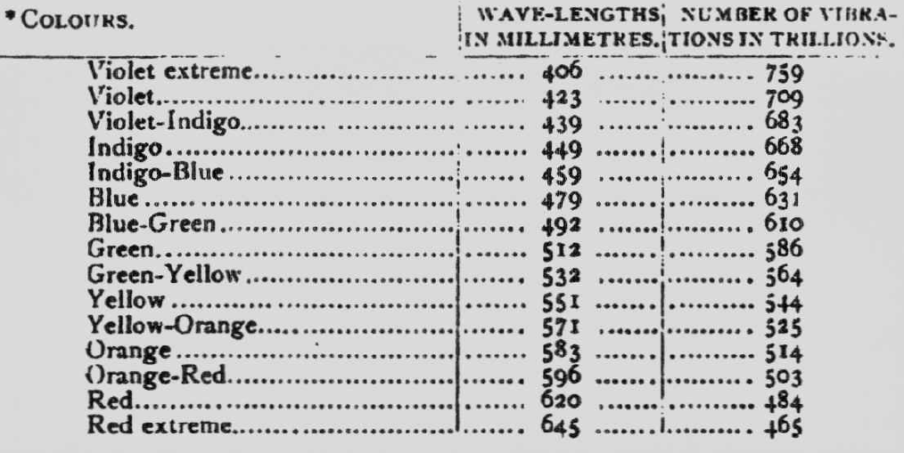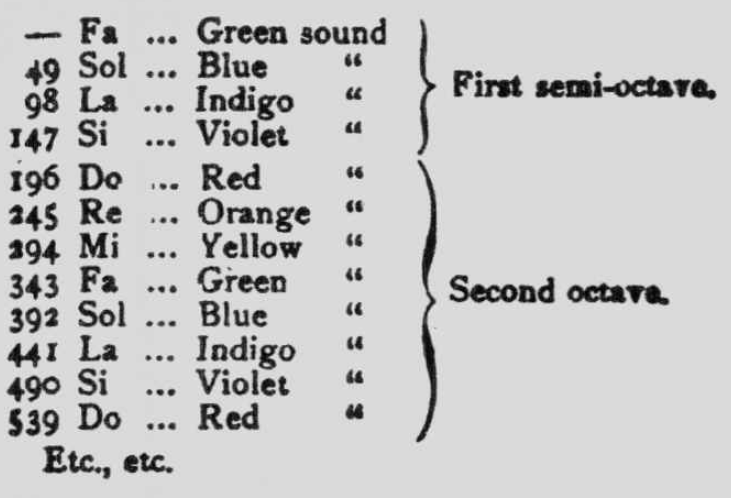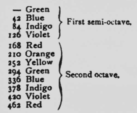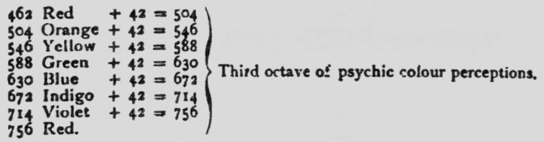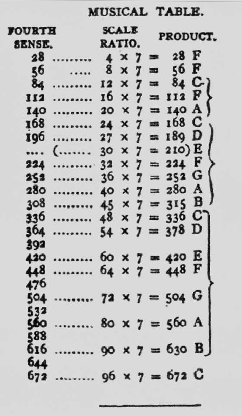 By a similar calculation we can put an octave below C', and above C". Writing these three octaves in line, and multiplying by seven, we obtain a nearly exact correspondence with our table of vibrations for the fourth sense. MUSICAL TABLE