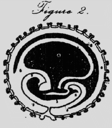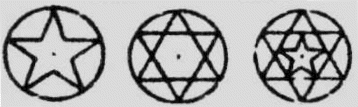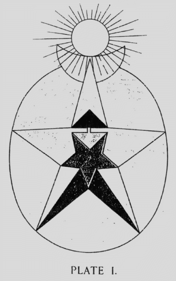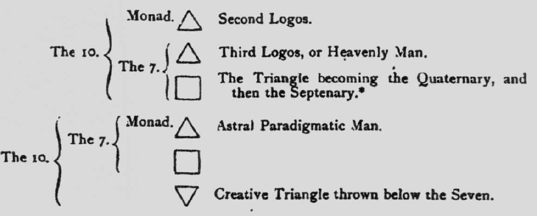Ragon. *** 1. Embryo. 2. Amniotic Fluid (Liquor Amnii) in which the Embryo floats. 3. Amnion, a foetal membrane surrounding the Embryo, and containing the Amniotic Fluid. 4. Umbilical Vesicle, or Yolk Sac, containing the Yolk, the source of nutrition to the early Embryo. 5. Allantois, a vesicle proceeding from the extremity of the Embryo, spreading itself throughout the interior of the Ovum. 6. Interspace between the outer layer of the Ovum and the Amnion, in which are contained the Umbilical Vesicle and Allantois. 7. Chorion, or False Amnion, formed by the outer layer of the Ovum. Figure I is a representation of the Ovum before the Amnion and Chorion are fully discernable; the Allantois (5) also is in the first stages of its development. Figure 2 shows the Allantois spreading itself through the Interspace (6): here the Yolk Sac has considerably shrunk. Nos. 3 are projections forming the Amnion. Figure 3 shows the Yolk Sac still further shrunk; the Allantois has completely spread itself in the Interspace between the Amnion and Chorion (false Amnion), against the walls of the latter, which has grown in the form of ramified villi into the substance of the uterine mucous membrane. In later stages the latter forms the Placenta. *** DIAGRAM 1 1st. -- Macrocosm and Its 3, 7, or 10 Centres of Creative Forces. A. Sexless, Unmanifested Logos. a. Creative Logos. D. The Spiritual Forces acting in Matter A.B.C. The Unknowable. a.b.c. This is Pradhana, undifferentiated matter in Sankhya philosophy, or Good, Evil and Chaotic Darkness (Sattva, Rajas, and Tamas) neutralizing each other. When differentiated, they become the Seven Creative Potencies: Spirit, Substance and Fire stimulating Matter to form itself. 2d. Microcosm (the Inner Man and His 3, 7, or 10 Centres of Potential Forces. (ATMAN, although exoterically reckoned as the seventh principle, is no individual principle at all, and belongs to the Universal Soul; 7 is the AURIC EGG, the Magnetic Sphere round every human and animal being.) 1. BUDDHI, the vehicle of ATMA. 2. MANAS, the vehicle of BUDDHI. 3. LOWER MANAS (the Upper and Lower MANAS are two aspects of one and the same princiople) and 4. KAMA RUPA, its vehicle. 5. PRANA, Life, and 6. LINGA SARIRA, its vehicle. I. II. III. are the Three Hypostases of ATMAN, its contact with Nature and Man being the Fourth, making it a Quaternary, or Tetraktys, the Higher Self. 1, 2, 3, 4, 5, 6. These six principles, acting on four different planes, and having their AURIC ENVELOPE on the seventh (vide infra), are those used by the Adepts of the Right-Hand, or White Magicians. * The Physical Body is no principle; it is entirely ignored, being used only in Black Magic. 3. -- Microcosm (the Physical Man) and His 10 Orifices, or Centres of Action. 1. (BUDDHI) Right Eye. 2. (MANAS) Left Eye. 3. (LOWER MANAS) Right Ear. 4. (KAMA RUPA) Left Ear. 5. (LIFE PRINCIPLE) Right Nostril. 6. (LIFE VEHICLE) Left Nostril. 7. The Paradigm of the 10th (creative) orifice in the Lower Triad. 8. 9, 10. As this Lower Ternary has a direct connection with the Higher Atmic Triad and its three aspects (creative, preservative and destructive, or rather regenerative), the abuse of the corresponding functions is the most terrible of Karmic Sins -- the Sin against the Holy Ghost with the Christians. These Physical Organs are used only by Dugpas in Black Magic. *** PLATE I. PLATE l. In Plate 1, we see that ATMA is no "principle," but stands separate from the Man, whose seven "principles" are represented as follows: 7th, AURIC EGG, coloured Blue. 6th, BUDDHI, coloured Yellow. 5th, MANAS: The UPPER, represented as a triangle with its apex pointing upwards, coloured Indigo Blue. The LOWER, represented by a triangle with its apex pointing downwards, coloured Green. 4th KAMA, represented as a five-pointed star, with the "horns of evil" upwards, embracing the LOWER MANAS, coloured Blood-Red. 3d. LINGA SARIRA, coloured Violet as the vehicle of PRANA (Orange), and partaking of KAMA (Red), and occasionally of the AURIC ENVELOPE (Blue). 2d, PRANA, Life, coloured Orange, the hue of the ascetic's robes. 1st, STHULA SARIRA, the Physical Body of Man, represented by the mayavic contour of the large five-pointed star within the AURIC EGG. *** DIAGRAM II. ATMAN is no Number, and corresponds to no visible Planet, for it proceeds from the Spiritual Sun; nor does it bear any relation either to Sound, Colour, or the rest, for it includes them all. As the Human Principles have no Numbers per se, but only correspond to Numbers, Sounds, Colours, etc., they are not enumerated here in the order used for exoteric purposes. DIAGRAM II.