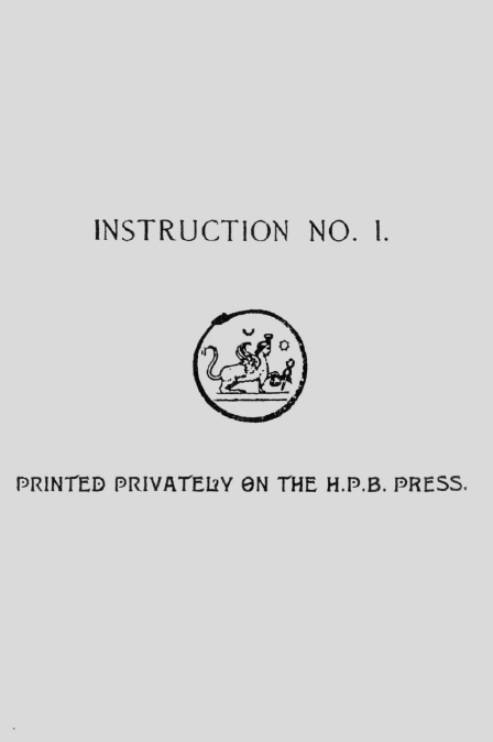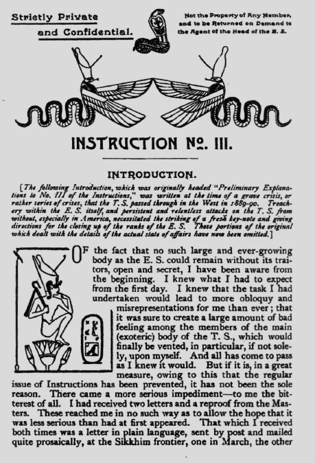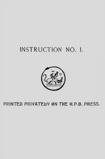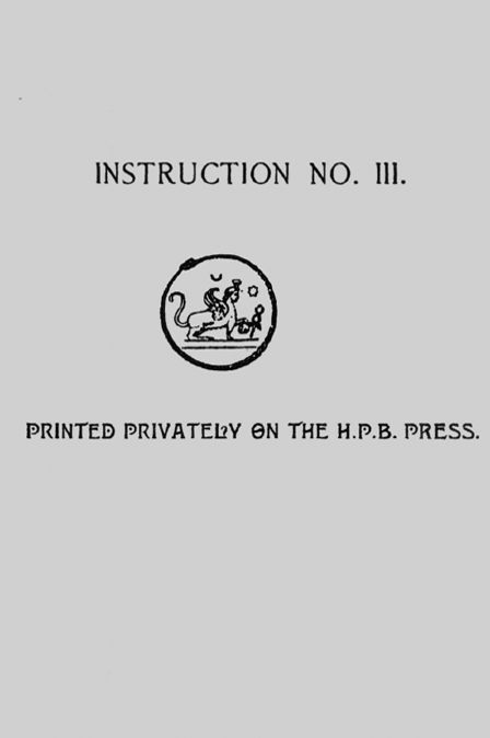 Strictly Private and Confidential. Not the Property of Any Members, and to be Returned on Demand to the Agent of the Head of the N.S. INTRODUCTION. [The following Introduction, which was originally headed "Preliminary Explanations to No. III of the Instructions," was written at the time of a grave crisis, or rather series of crises, that the T.S. passed through in the West in 1889-90. Treachery within the E.S. itself, and persistent and relentless attacks on the T.S. from without, especially in America, necessitated the striking of a fresh key-note and giving directions for the closing up of the ranks of the E.S. Those portions of the original which dealt with the details of the actual state of affairs have now been omitted.] OF the fact that no such large and ever-growing body as the E.S. could remain without its traitors, open and secret, I have been aware from the beginning. I knew what I had to expect from the first day. I knew that the task I had undertaken would lead to more obloquy and misrepresentations for me than ever; that it was sure to create a large amount of bad feeling among the members of the main (exoteric) body of the T.S., which would finally be vented, in particular, if not solely, upon myself. And all has come to pass as I knew it would. But if it is, in a great measure, owing to this that the regular issue of Instructions has been prevented, it has not been the sole reason. There came a more serious impediment -- to me the bitterest of all. I had received two letters and a reproof from the Masters. These reached me in no such way as to allow the hope that it was less serious than had at first appeared. That which I received both times was a letter in plain language, sent by post and mailed quite prosaically, at the Sikkhim frontier, one in March, the other in August, 1889. The last of these left me no ephemeral hope that I had misunderstood or even exaggerated the facts. In their first, our Masters were displeased, and in their last, which arrived just as the news of a flagrant case of treachery reached me, that displeasure became still more apparent. I was told to keep back Instruction No. III until further developments, and then to make those portions of the contents of the Masters' letter that related to the E.S. known to all its members, without even omitting to show them how mistaken and dangerous had been my policy in the E.S. from its beginning. I had been warned by the Council and my trusted friends, of the danger there was in admitting such a number of persons, scattered so widely over the world, who, it was added, knew me not, except on hearsay, and each of whom I had no other means, as they supposed, of studying, than through their auras and photographs. I myself realized that danger, but had no means of averting it, since the Book of the Discipline and Rules states that: "No one shall be refused admission, of the chance of learning truth and thereby improving his life, only because some one, or even all his neighbours think ill of him." Such is the rule. Therefore, the larger the number of applicants who take the pledge, the greater the possibility of helping the masses. A member of the T.S. may be utterly unfit for the higher sciences and never grasp the true teachings of Occultism and Esoteric Philosophy; but yet if he has the true spark of the divine, and faith in the real presence of the HIGHER SELF in him, he will remain loyal to his pledge, and will try to model his life in accordance with the rules of the E.S., and thereby become nobler and better in every case. Membership in the E.S. and "pledges" signed, sent, and accepted, are no warrants for a high success, nor do these pledges aim at making of every student an adept or a magician. They are simply the seeds in which lurks the potentiality of every truth, the germ of that progress which will be the heirloom of only the seventh perfect Race. A handful of such seeds has been entrusted to me by the keepers of these truths, and it is my duty to sow them there, where I perceive a possibility of growth. It is the parable of the Sower put once more into practice, and a fresh lesson to be derived from its new application. The seeds that fall into good ground will bring forth fruit an hundredfold, and thus repay in each case the waste of those seeds which will have fallen by the wayside, on stony hearts and among the thorns of human passions. It is the duty of the Sower to choose the best soil for the future crops. But he is held responsible only so far as that ability is directly connected with the failures, and that such are solely due to it; it is the Karma of the individuals who receive the seeds by asking for them, that will repay or punish those who fail in their duties to their HIGHER SELF. Nature is ever struggling, even in its so-called inorganic and inanimate kingdoms, towards progress and perfectibility by production; how much more so the nature of conscious, thinking man! Each of us, if his nature is not productive or deep enough of itself, may borrow and derive material for soil from the seeds themselves which he receives; and everyone has the means of avoiding the scorching sun, and of forcing the seeds to strike root, or preventing the thorns choking them, with very little effort indeed. Therefore my mistake did not lie in that I accepted too readily applications to join the E.S. Nor have I sinned even in accepting men and women of whom I have not felt quite sure, though the opportunity of discerning their inner natures was possible and given to me in almost every instance. I have not sinned in this, I say, as some think, because the Rules teach again that the grand ethics taught in the secret Aryasanga schools are not for the benefit or perfection of saints, but verily of sinners who need moral and intellectual help. In what particular, then, have I failed to do my duty? Simply in this, as am shown: I have begun to give out Eastern teachings to those who are unacquainted with the Easter