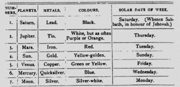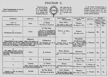Thus it will be seen that the influence of the solar system in the exoteric Kabalistic Astrology is by this method distributed over the entire human body, the primary metals, and the gradations of colour from black to white; but that Esotericism recognizes neither black nor white as colours, because it holds religiously to the seven solar or natural colours of the prism. Black and white are artificial tints. They belong to the Earth, and are only perceived by virtue of the special construction of our physical organs. White is the absence of all colours, and therefore no colour; black is simply the absence of light, and therefore the negative aspect of white. The seven prismatic colours are direct emanations from the Seven Hierarchies of Being, each of which has a direct bearing upon and relation to one of the human principles, since each of these Hierarchies is, in fact, the creator and source of the corresponding human principle. Each prismatic colour is called in Occultism the "Father of the Sound" which corresponds to it; sound being the Word, or the Logos, of its Father-Thought. This is the reason why sensitives connect every colour with a definite sound, a fact well recognized in modern science, (e.g., Francis Galton's Nature and Nurture). But black and white are entirely negative colours, and have no representatives in the world of subjective being. Kabalistic Astrology says that the dominion of the planetary bodies in the human brain also is defined thus: there are seven primary groups of faculties, six of which function through the cerebrum, and the seventh through the cerebellum. This is perfectly correct esoterically. But when it is further said that: Saturn governs the devotional faculties; Mercury, the intellectual; Jupiter, the sympathetic; the Sun, the governing faculties; Mars, the selfish; Venus, the tenacious; and the Moon, the instincts; -- we say that the explanation is incomplete and even misleading. For, in the first place, the physical planets can rule only the physical body and the purely physical functions. All the mental, emotional, psychic and spiritual faculties are influenced by the occult properties of the scale of causes which emanate from the Hierarchies of the Spiritual Rulers of the planets, and not by the planets themselves. This scale, as given in Diagram II, leads the student to perceive in the following order: (1) colour; (2) sound; (3) the sound materializes into the spirit of the metals, i. e., the metallic Elementals; (4) these materialize again into the physical metals; (5) then the harmonial and vibratory radiant essence passes into the plants, giving them colour and smell, both of which "properties" depend upon the rate of vibration of this energy per unit of time; (6) from plants it passes into the animals; (7) and finally culminates in the "principles" of man. Thus we see the divine essence of our Progenitors in heaven circling through seven stages; spirit becoming matter, and matter returning to spirit. As there is sound in nature which is inaudible, so there is colour which is invisible, but which can be heard. The creative force, at work in its incessant task of transformation, produces colour, sound and numbers, in the shape of rates of vibration which compound and dissociate the atoms and molecules. Though invisible and inaudible to us in detail, yet the synthesis of the whole becomes audible to us on the material plane. It is that which the Chinese call the "Great Tone," or Kung. It is, even by scientific confession, the actual tonic of nature, held by musicians to be the middle Fa on the keyboard of a piano. We hear it distinctly in the voice of nature, in the roaring of the ocean, in the sound of the foliage of a great forest, in the distant roar of a great city; in the wind, the tempest and the storm: in short, in everything in nature which has a voice or produces sound. To the hearing of all who hearken, it culminates in a single definite tone, of an unappreciable pitch, which, as said, is the F, or Fa, of the diatonic scale. From these particulars, that wherein lies the difference between the exoteric and the esoteric nomenclature and symbolism will be evident to the student of Occultism. In short, Kabalistic Astrology, as practised in Europe, is the semi-esoteric secret science, adapted for the outer and not for the inner circle. It is, furthermore, often left incomplete and not infrequently distorted to conceal the real truth. While it symbolizes and adopts its correspondences on the mere appearances of things, esoteric philosophy, which concerns itself preeminently with the essence of things, accepts only such symbols as cover the whole ground, i.e., such symbols as yield a spiritual as well as a psychic and physical meaning. Yet even Western Astrology has done excellent work, for it has helped to carry the knowledge of the existence of a Secret Wisdom throughout the dangers of the Mediaeval Ages and their dark bigotry up to the present day, when all danger has disappeared. The order of the planets in exoteric practice is that defined by their geocentric radii, or the distance of their several orbits from the Earth as a centre, viz: Saturn, Jupiter, Mars, Sun, Venus, Mercury and Moon. In the first three of these we find symbolized the celestial triad of supreme power in the physical, manifested universe, or Brahma, Vishnu and Siva; while in the last four we recognize the symbols of the terrestrial quaternary ruling over all natural and physical revolutions of the seasons, quarters of the day, points the compass, and elements. Thus:
