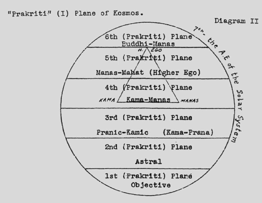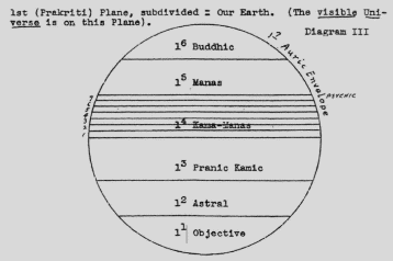 One with the Auric Envelope. Atmic Element. Auric Envelope: Contains all the "Karma" of the whole manifested Universe. Hiranyagarbha. N.B. Fohat runs like a thread through all. Diagram 2: "Prakriti" (I) Planes of Kosmos 7th: the A.E. of the Solar System Diagram 3: 1st (Prakriti) Plane, subdivided = our Earth. (The visible Universe is on this Plane). 16 Buddhic VI. December 3, 1890 Present: C.W., H.A.W.C., A.L.C., E.K., G.R.S.M., I.C-O., L.N.C., W.R.O., A.B., C.F.W. H.P.B. continued to explain the planes of consciousness. General Notes on Kosmic Septenary. Fohat: Fohat is everywhere; it runs like a threat through all & has its own 7 divisions. Auric Envelope: In the Kosmic Auric Envelope is all the Karma of the manifesting Universe; this is the Hiranyagarbha. Jiva is everywhere; so with the other principles. The diagram (2) represents the type of all Solar Systems. General Notes. Taking the figure to represent the human principles & planes of consciousness, then: -- 7, 6, 5, = Siva, Vishnu, Brahma; Brahman being the lowest. Siva, Vishnu, Brahma: Shiva is the four-faced Brahma, the Creator, Preserver, Destroyer & Regenerator. Between 5 & 4 comes the Antaskarana. The
