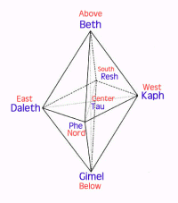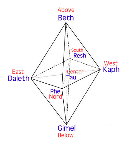 As the seven double letters place themselves on different levels of manifestation, they symbolize the formation of space. They represent the seven extremities of the world, the seven planets, the seven days of creation, the seven days of the week, and so on. As the seven double letters form a octahedron structure, the twelve vertices are equal to the twelve simple letters, see next. The fabric of space in which the seven double letters evolve, is divided into twelve parts, which are the twelve remaining letters, called Phashoutoth: He, Waw, Zain, Cheth, Teth, Yod, Lamed, Noun, Sameck, Ain, Tzade and Qoph. These twelve letters symbolize the twelve directions in space, the twelve signs of the zodiac, the twelve months of the year.